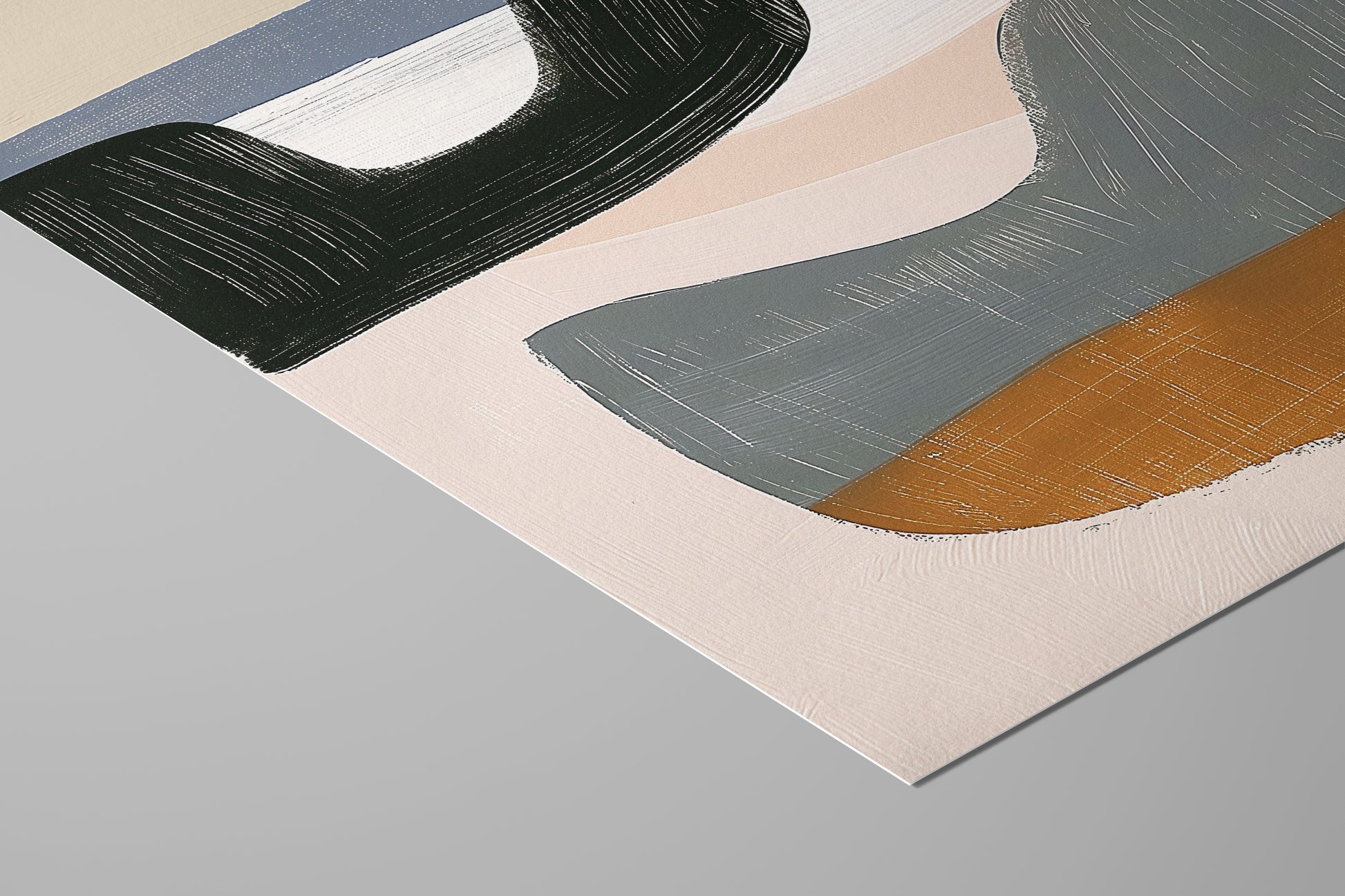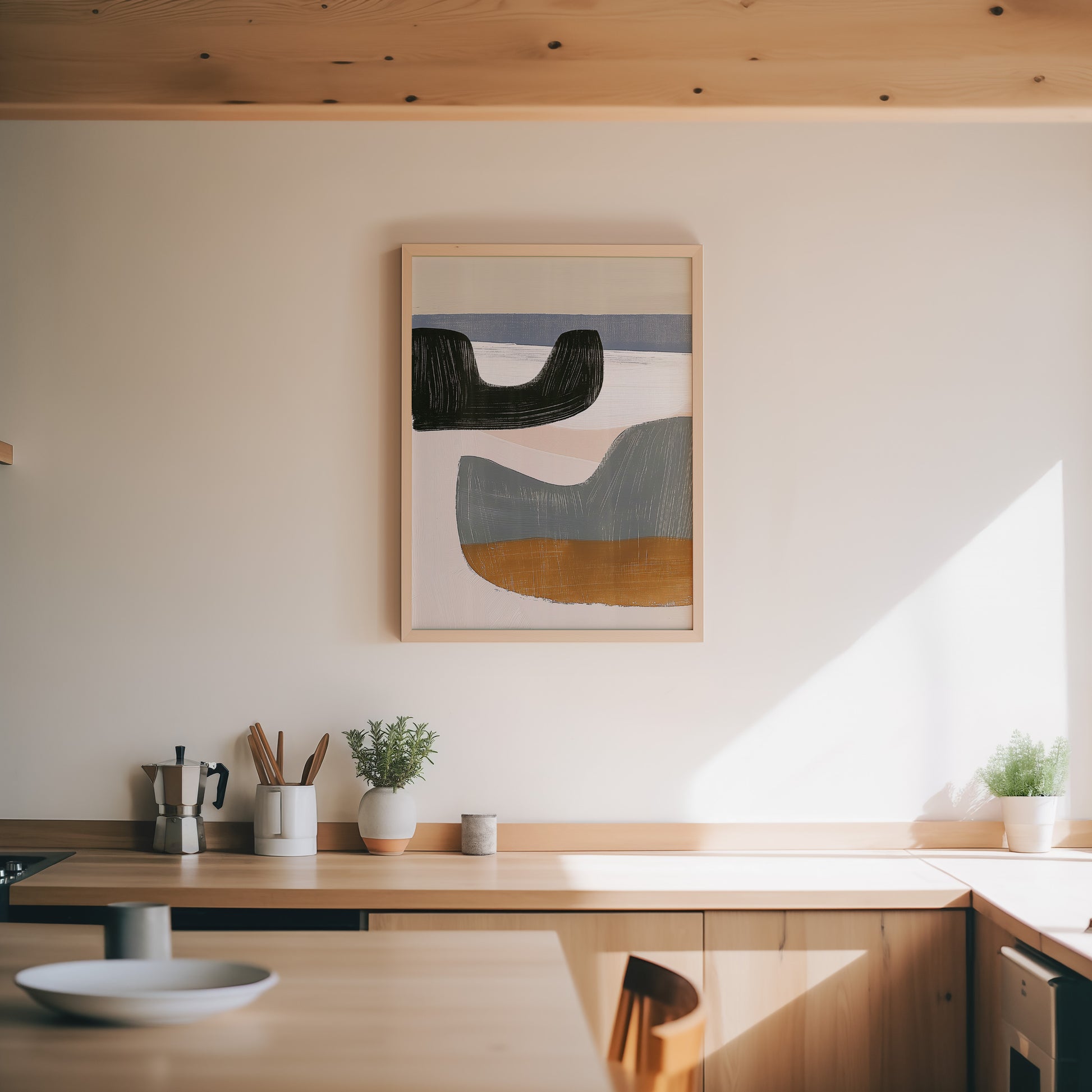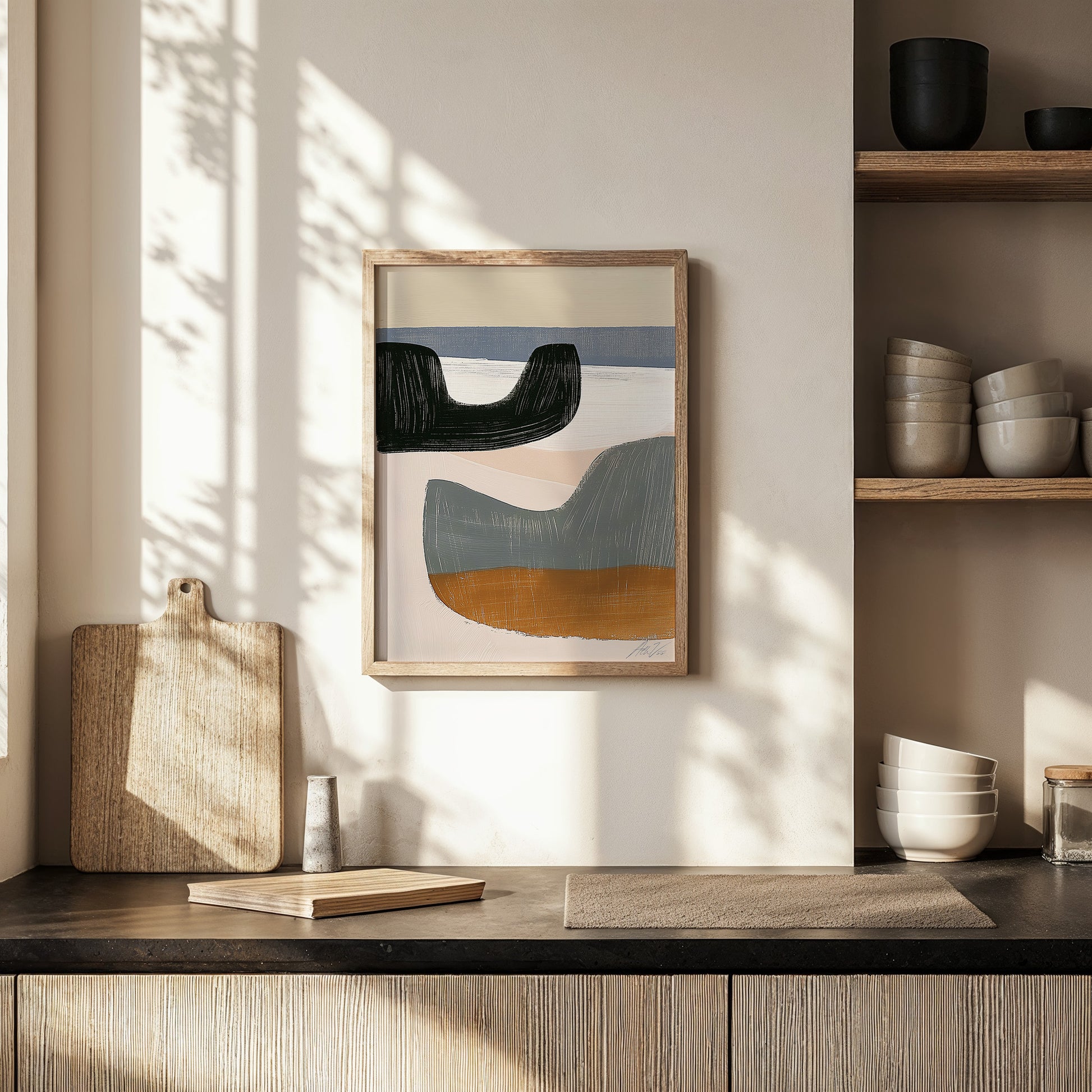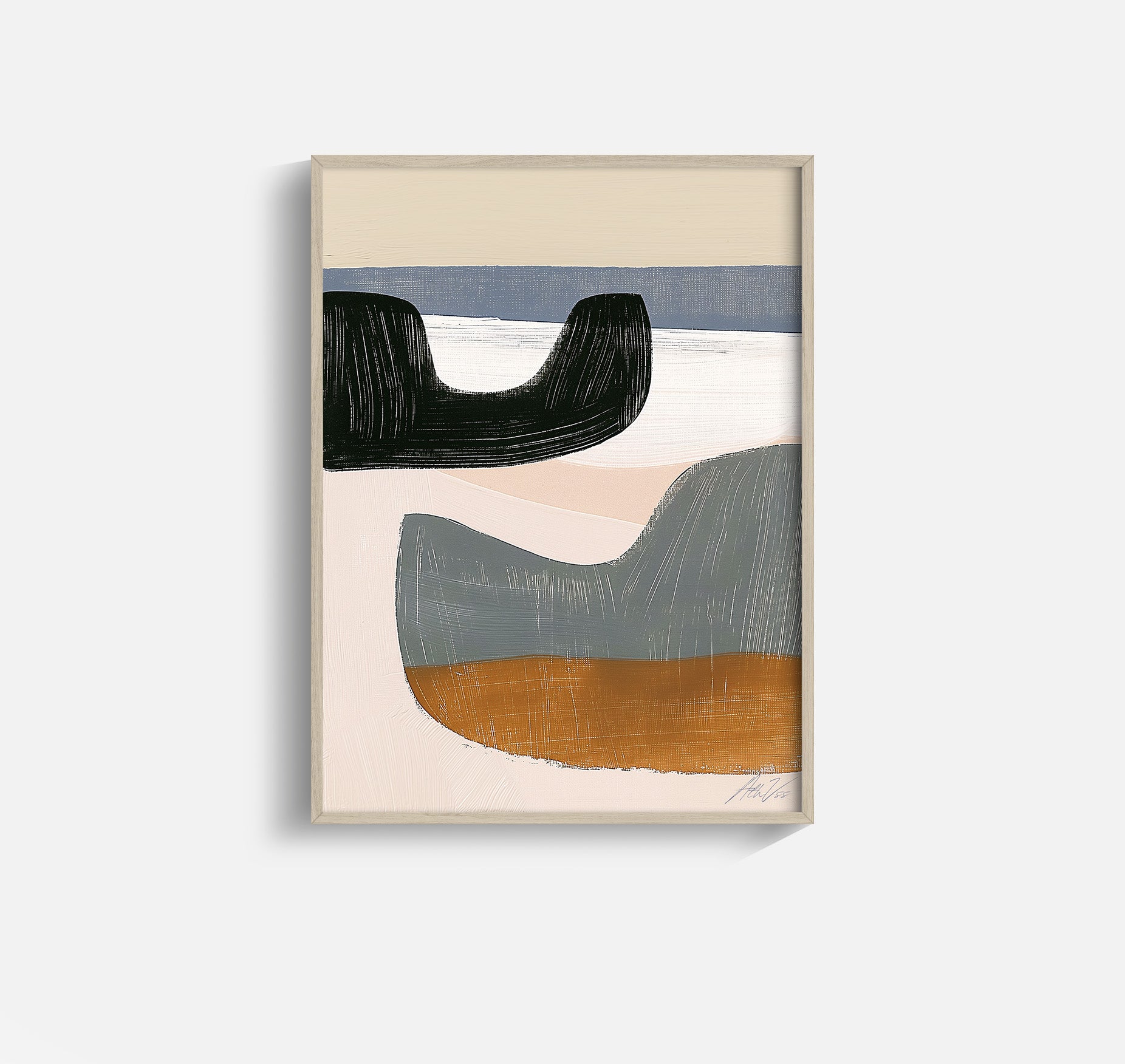 In Ships at Dusk, soft-edged forms drift like ancient Viking sails across a tranquil sky. Rendered in earthy ochre, stormy blue, and warm clay, this abstract composition pays quiet tribute to Nordic seafaring heritage. A striking yet calming piece that evokes both history and horizon, perfect for modern interiors with Scandinavian or coastal influence.