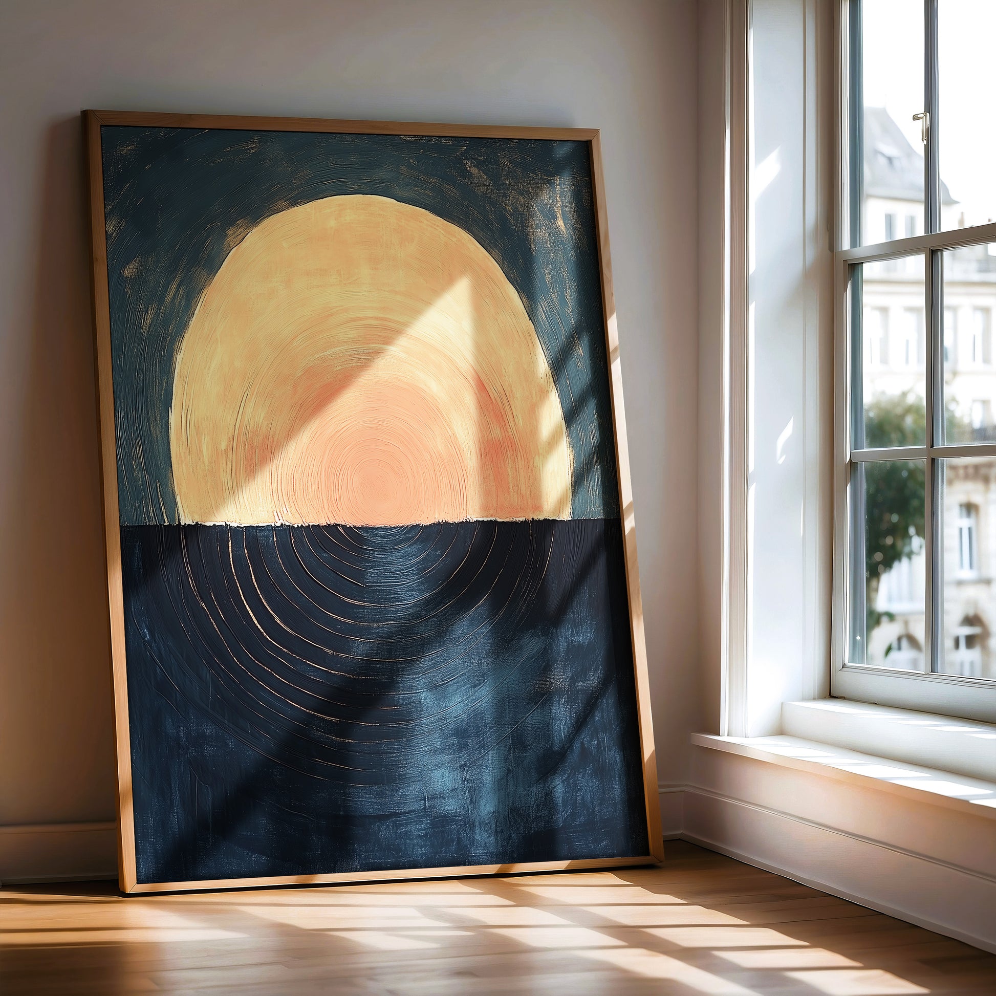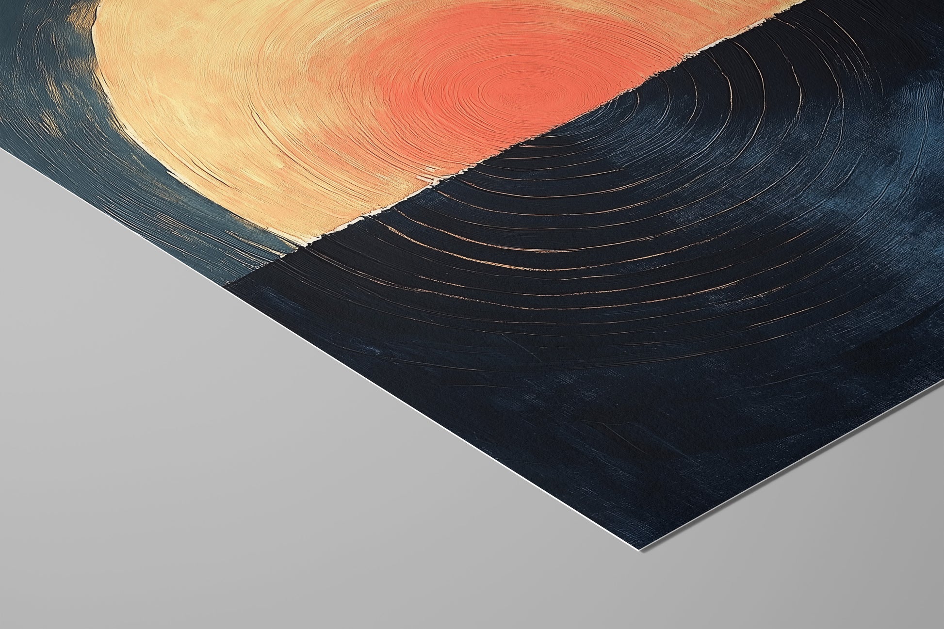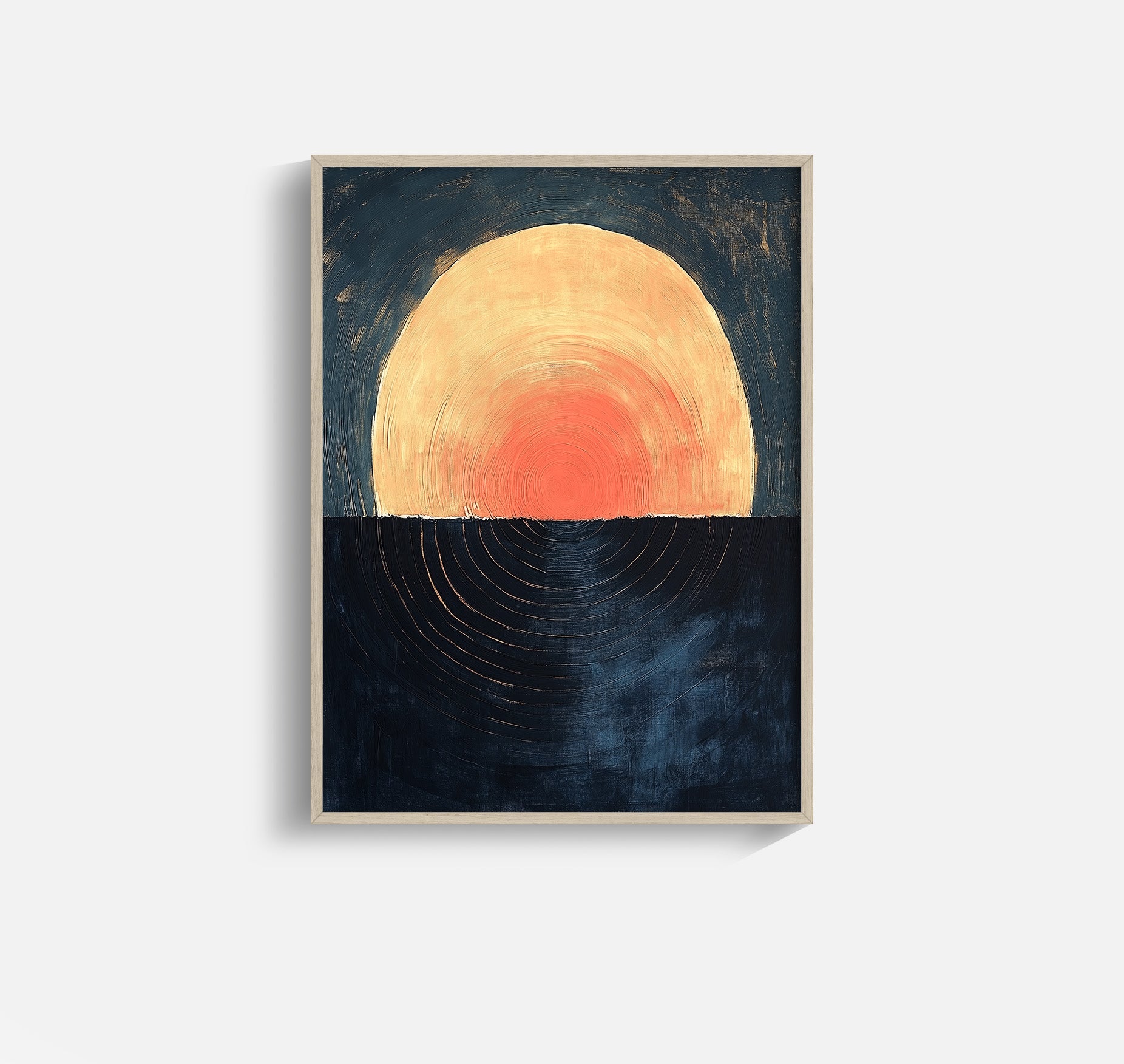 A striking meditation on light and contrast, Eclipse features a glowing sun-like form against a deep navy horizon, radiating with hand-painted concentric rings. This abstract print evokes both cosmic energy and serene balance — a perfect statement for minimalist or modern interiors.
