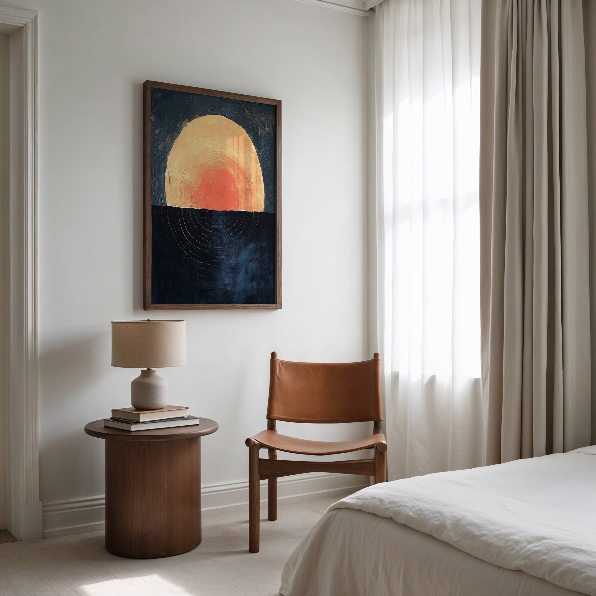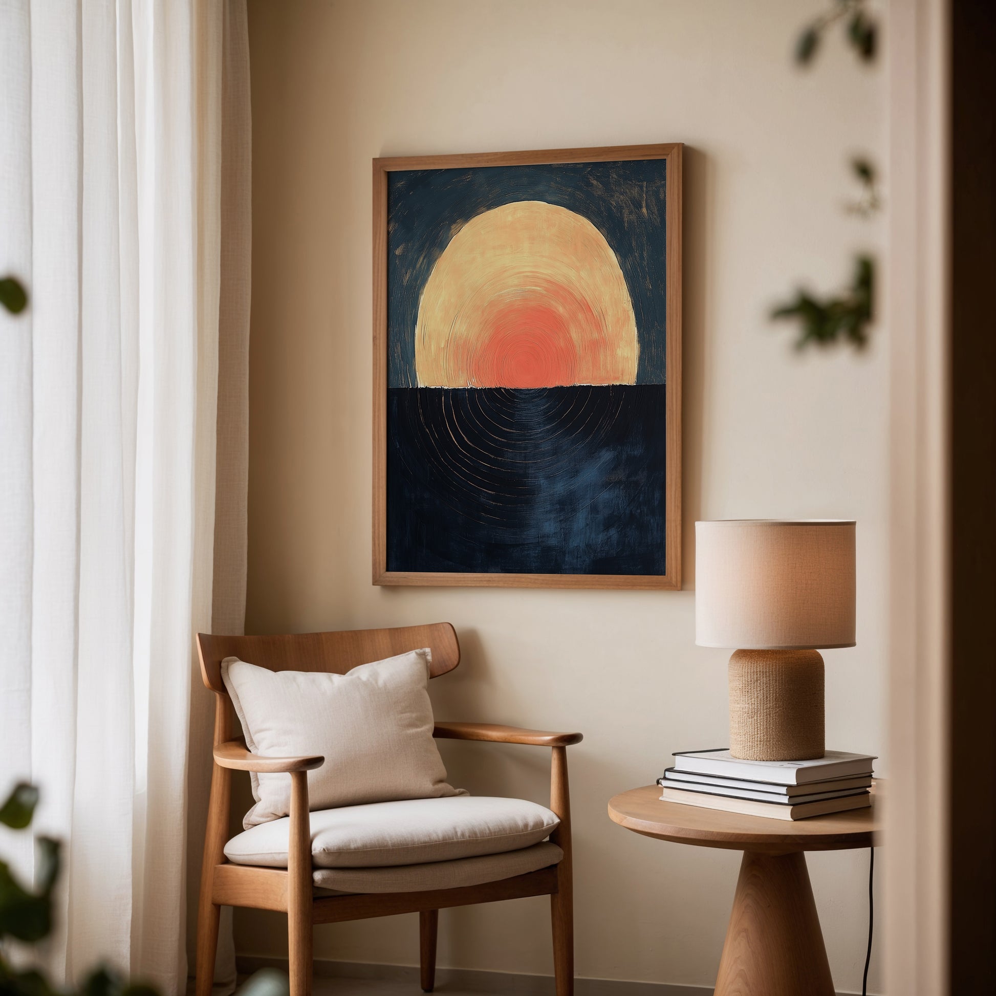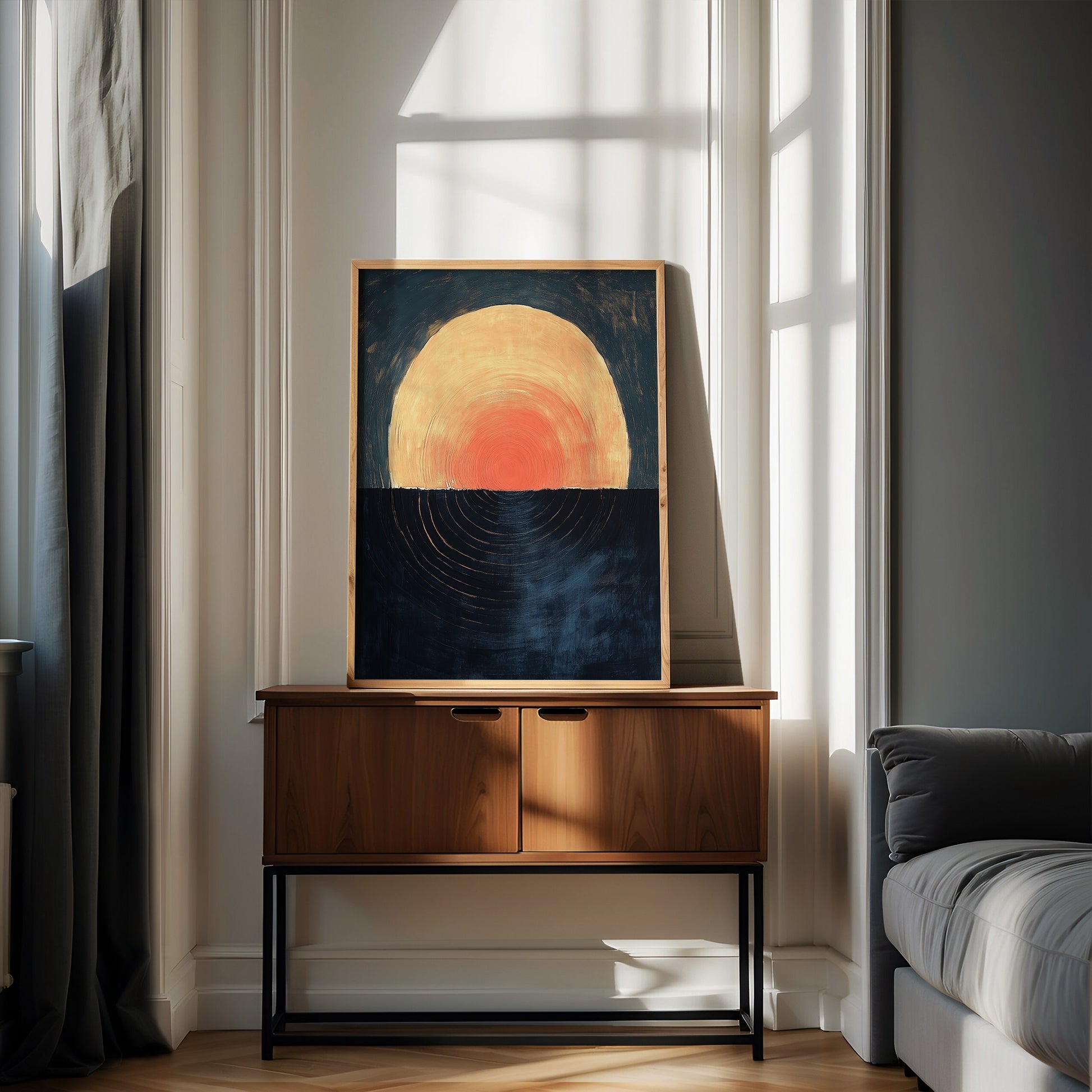 A striking meditation on light and contrast, Eclipse features a glowing sun-like form against a deep navy horizon, radiating with hand-painted concentric rings. This abstract print evokes both cosmic energy and serene balance — a perfect statement for minimalist or modern interiors.