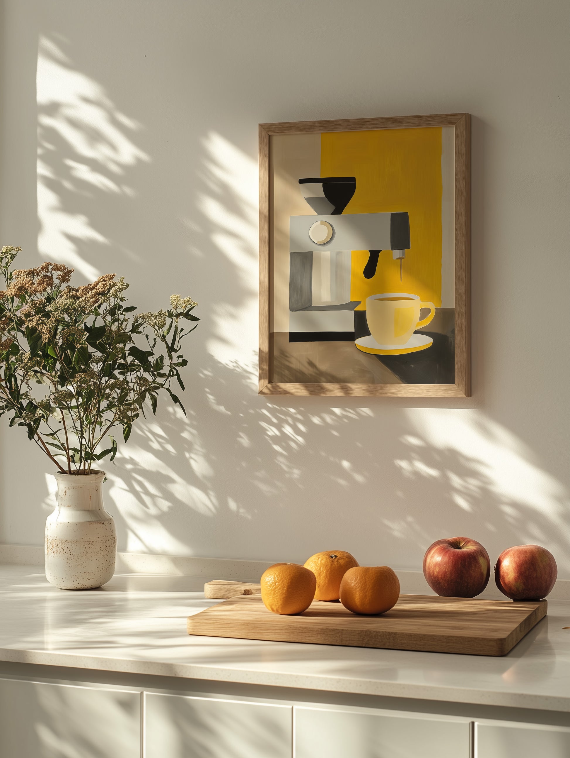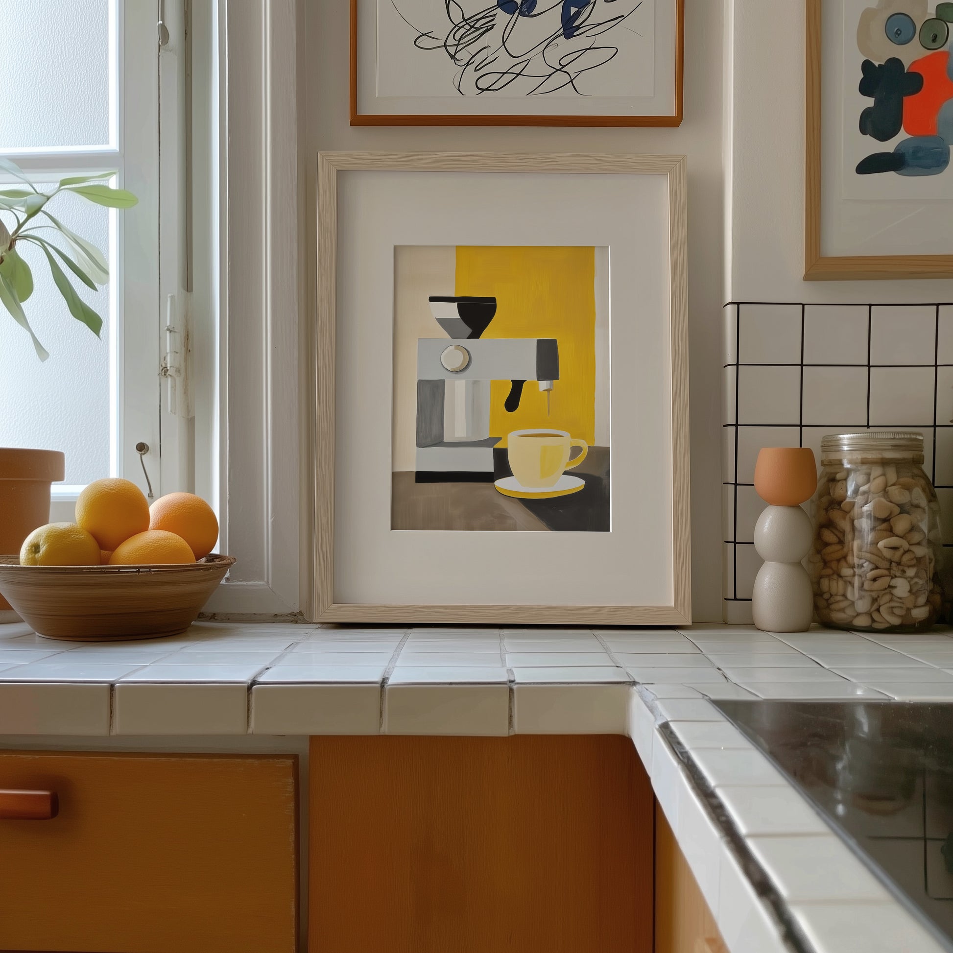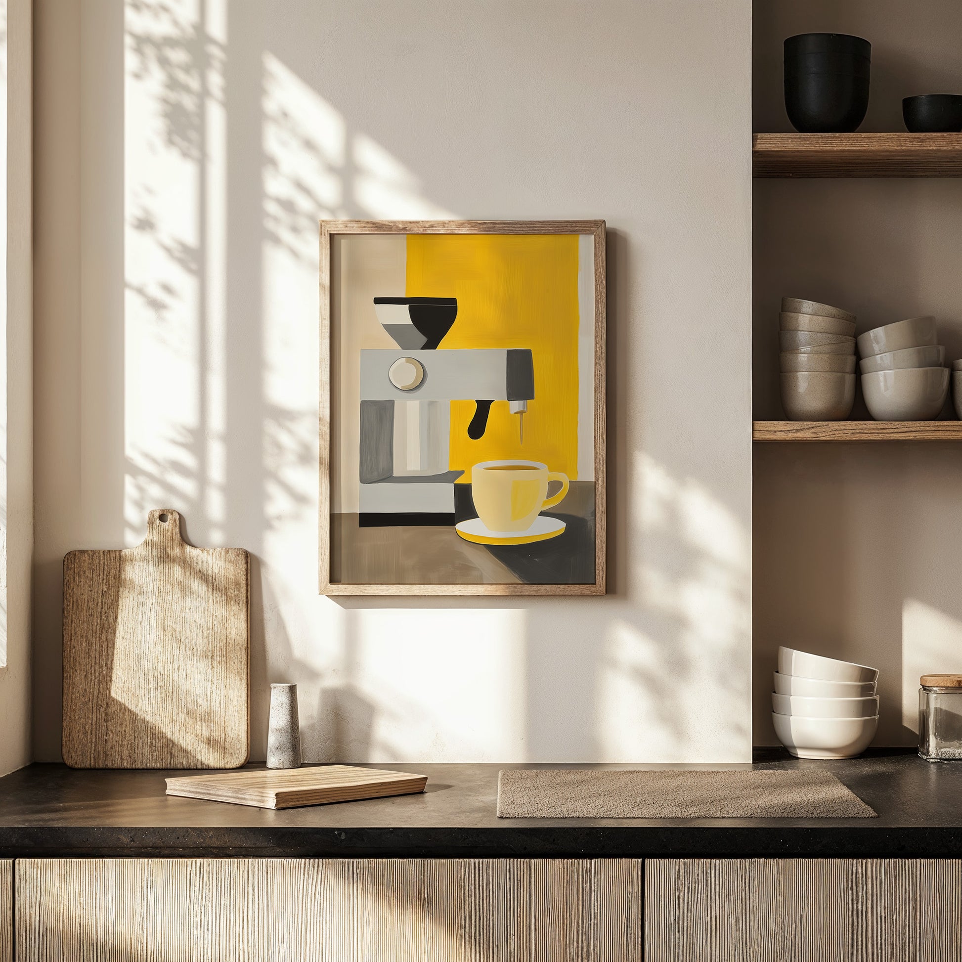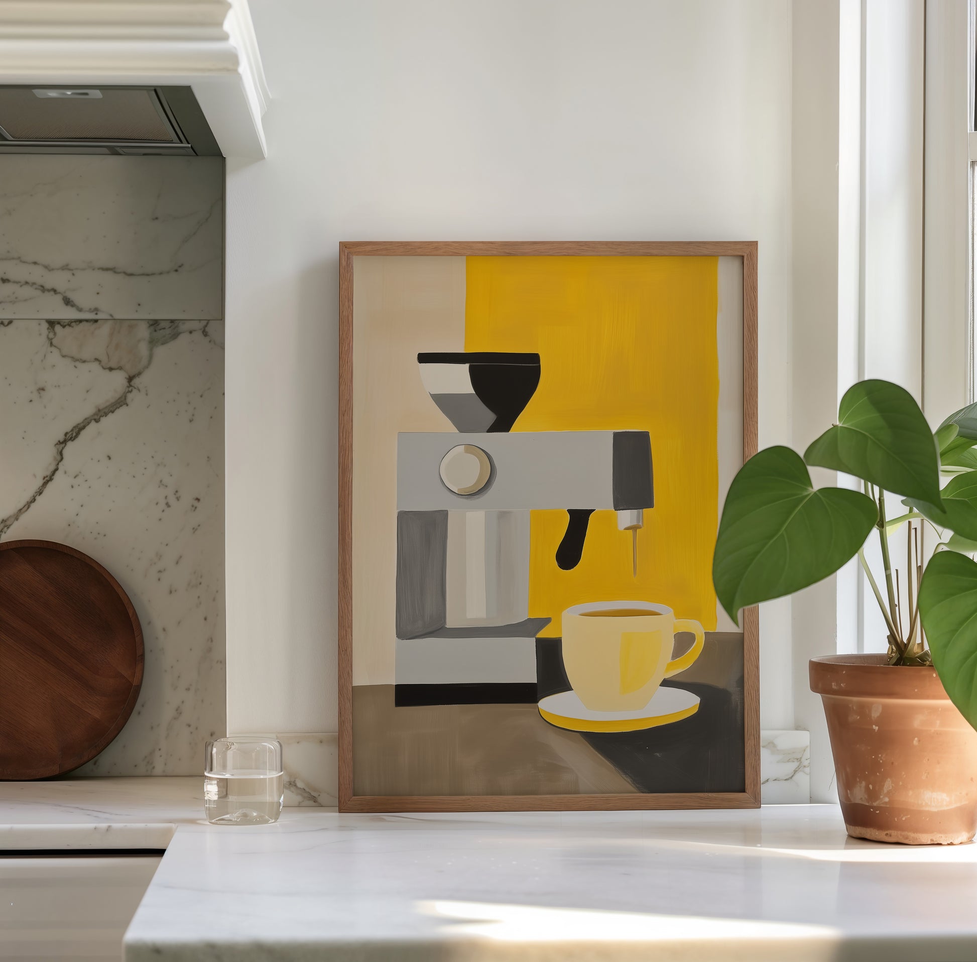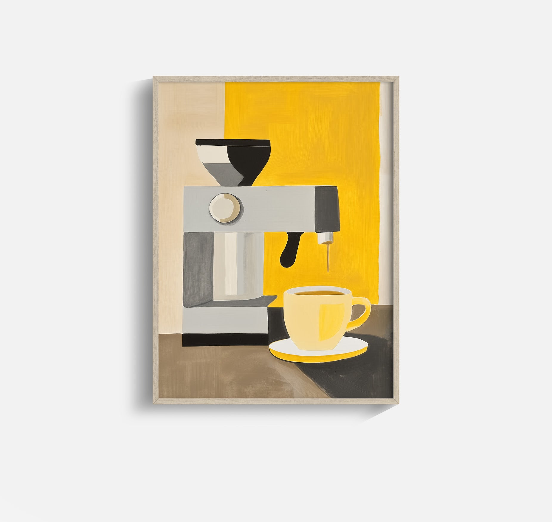 A playful yet refined tribute to the daily coffee ritual. This graphic kitchen print features a modern espresso machine and cup in warm yellow and cool gray tones, creating a bold pop of contrast for coffee lovers and design enthusiasts alike. Ideal for kitchens, cafés, or anywhere that could use a little jolt of personality.