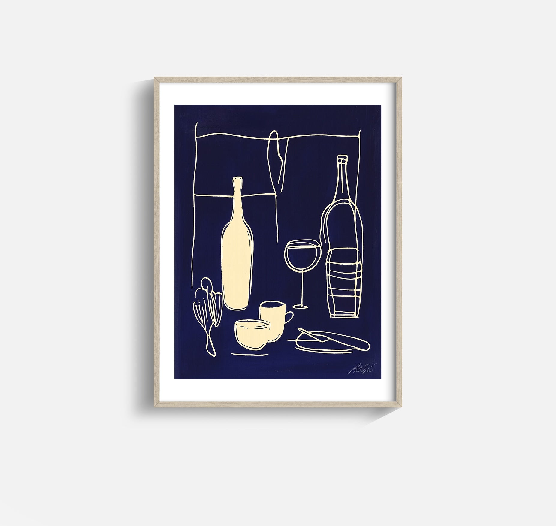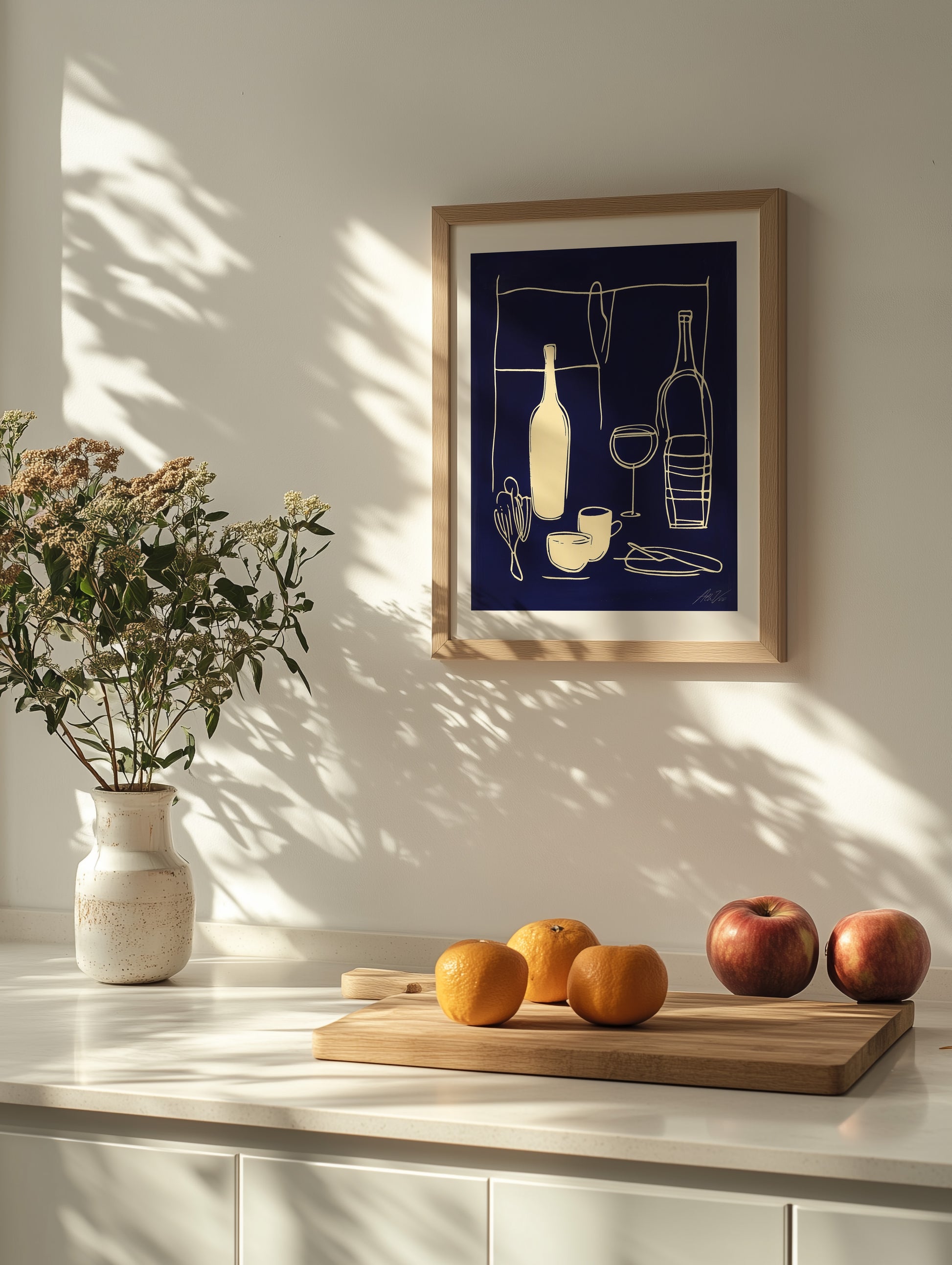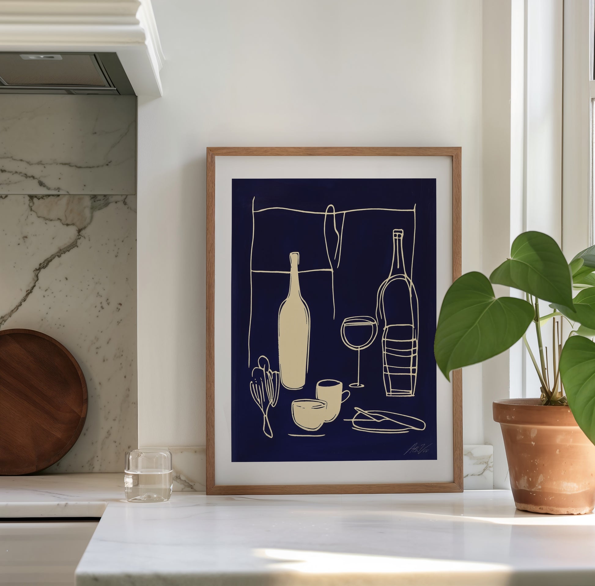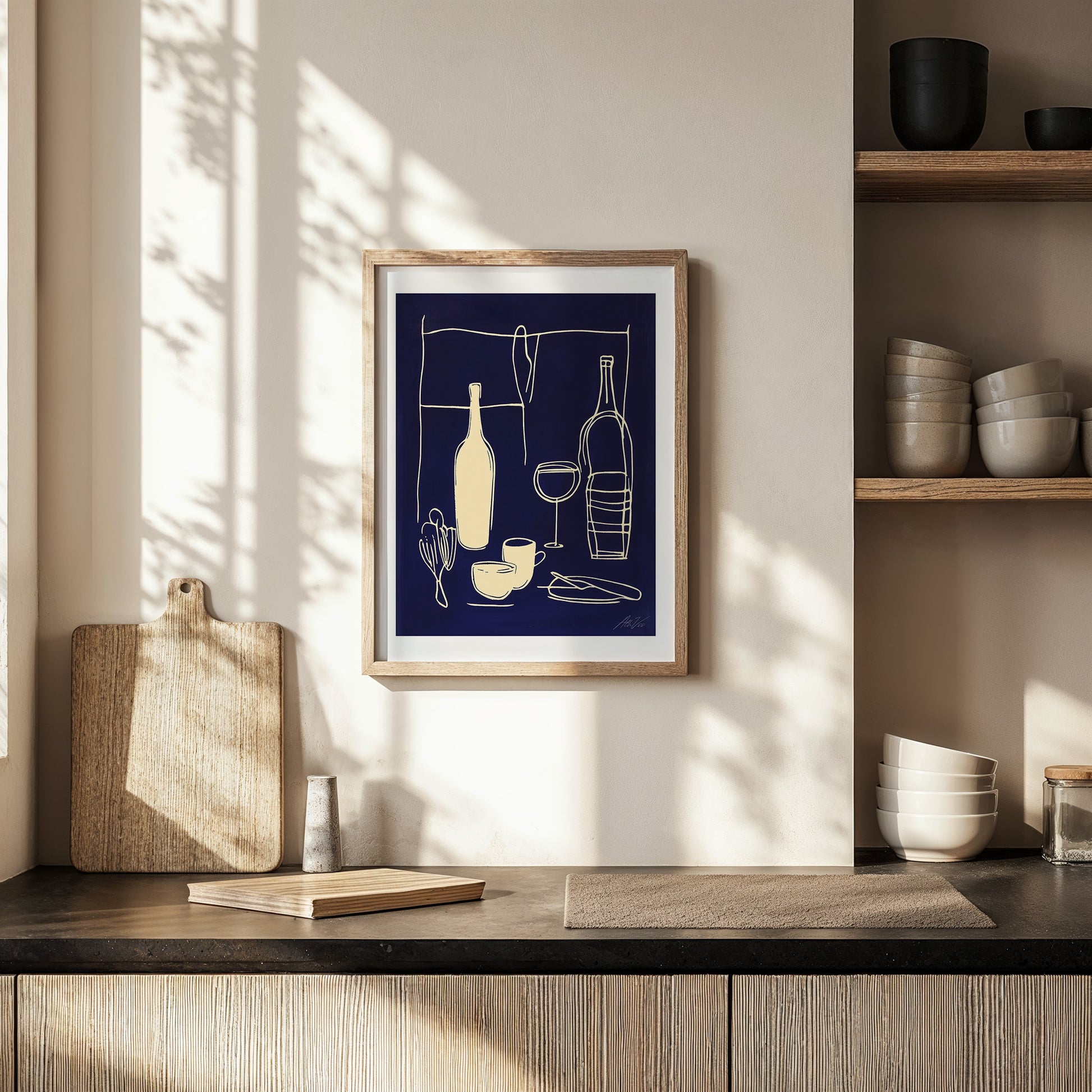 A moody navy backdrop meets soft buttery lines in this elegant one-line kitchen scene. Wine glasses, utensils, and ceramics come to life in a fluid, continuous stroke—perfect for a modern kitchen, dining nook, or wine bar. This piece adds refined whimsy while celebrating everyday rituals.