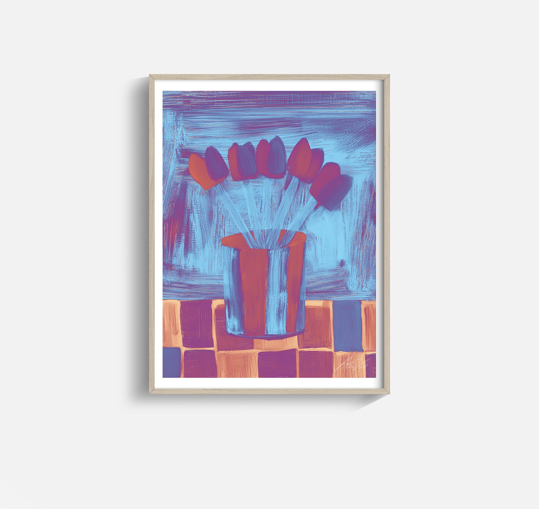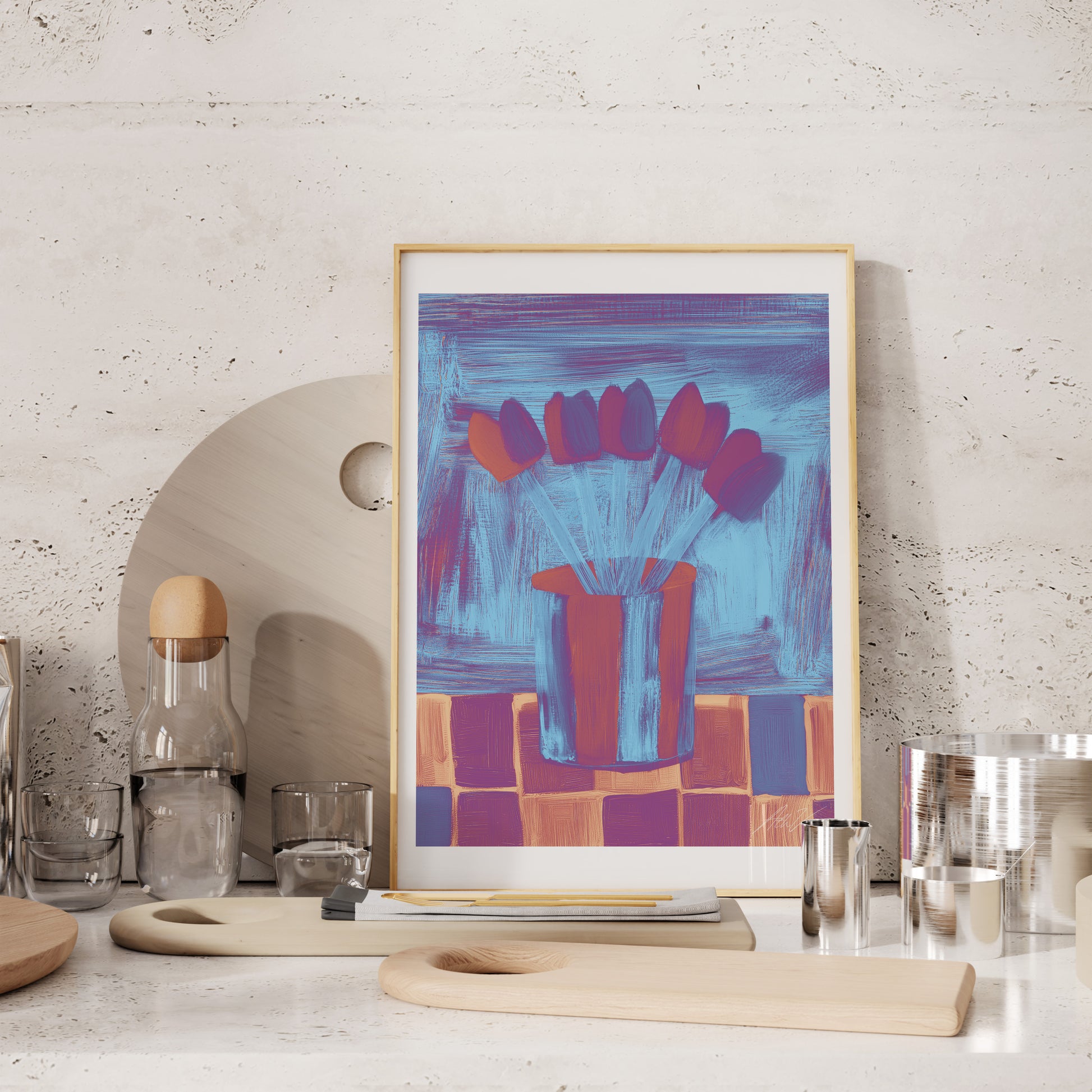 A bold reinterpretation of the classic still life, Flower Arrangement No. 2 bursts with expressive brushwork and saturated hues. Electric reds and violets dance across a vase of tulips, grounded by a checkered table in rich complementary tones. This piece celebrates texture, color, and joy — a modern floral that adds energy and warmth to any room.