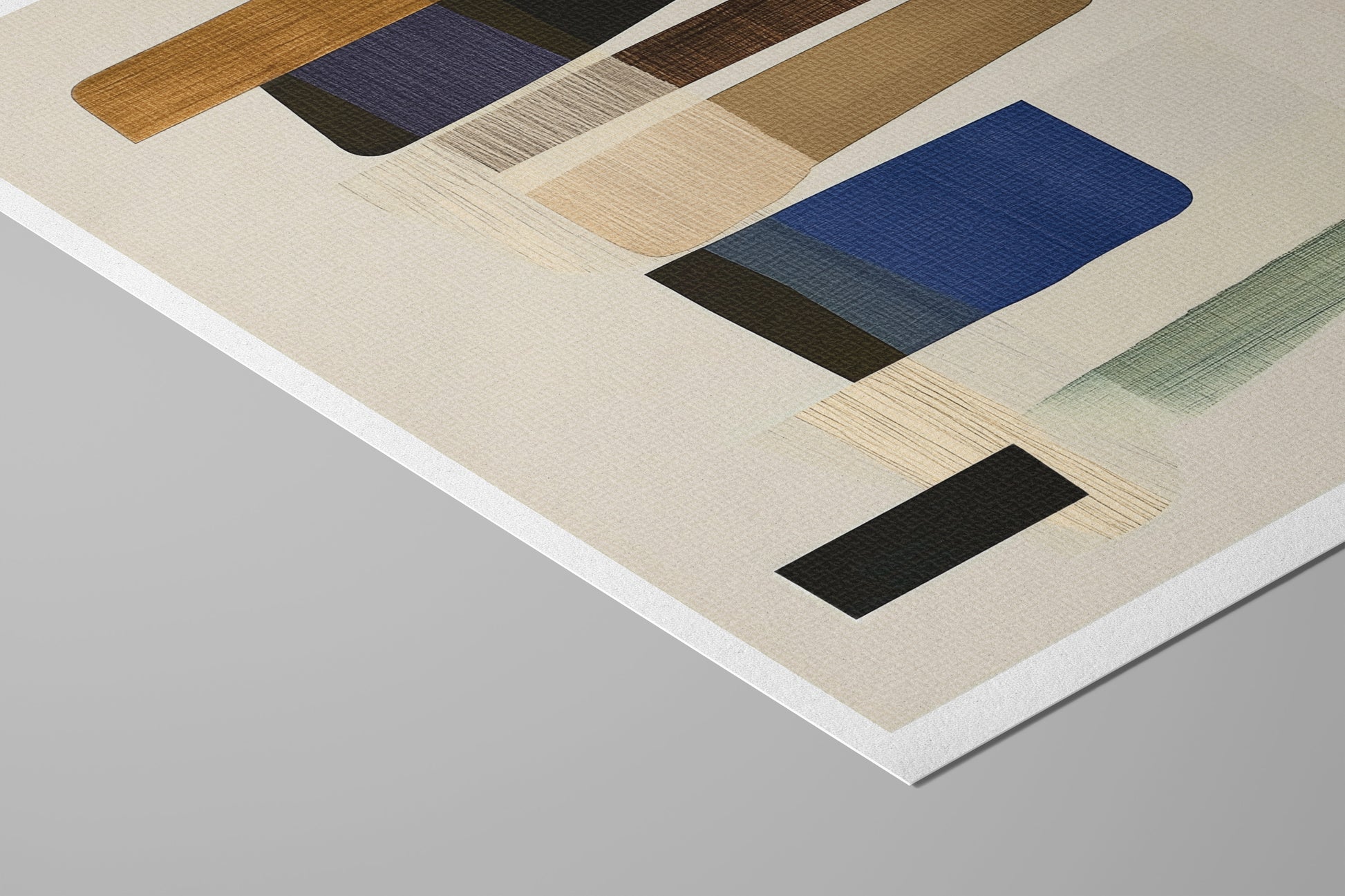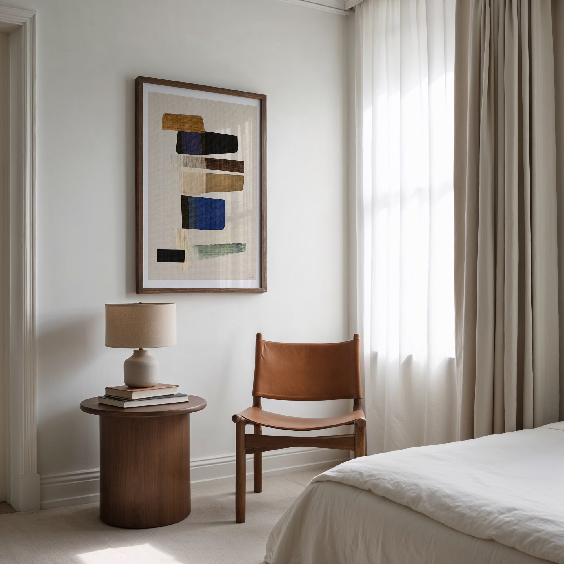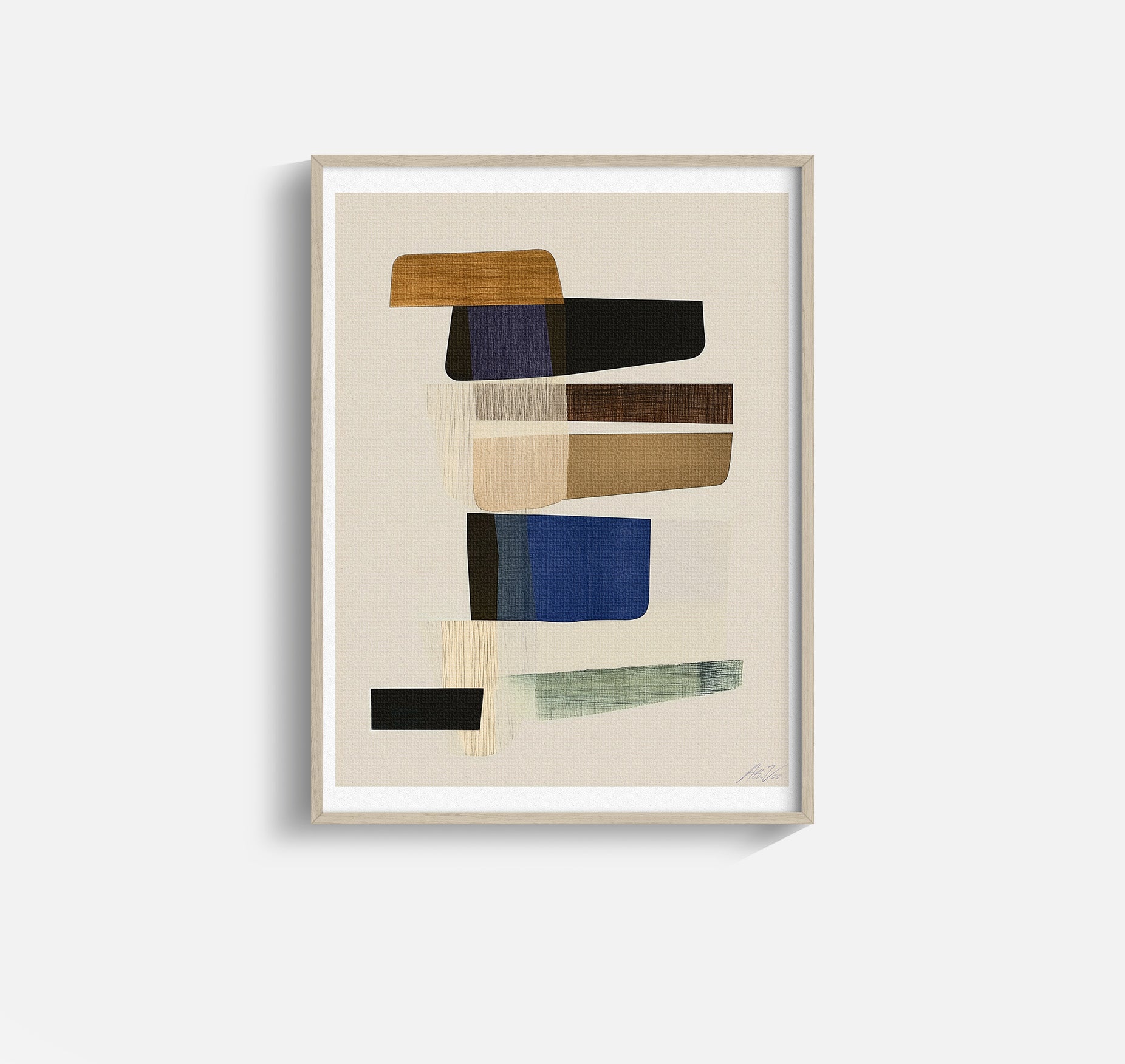 Layers of warm neutrals, deep blues, and grounded greens form a balanced abstract composition with a distinctly Scandinavian sensibility. The textured canvas, brushwork and subtle tonal shifts invite calm while adding quiet sophistication to any space. Perfect for modern interiors seeking art that blends refinement with a sense of ease.