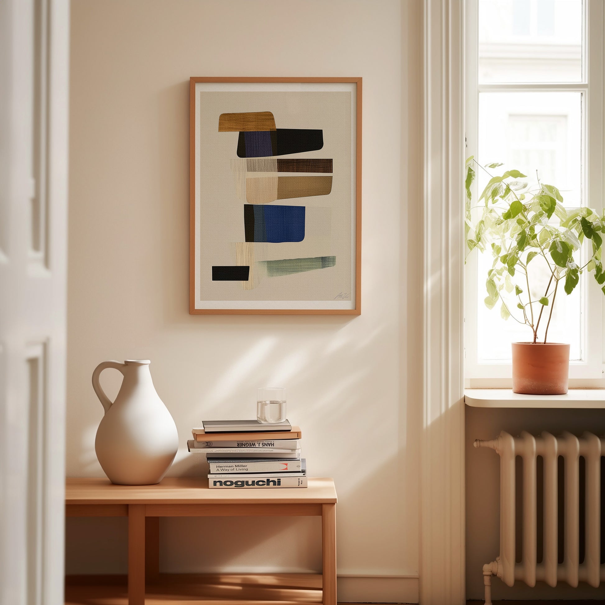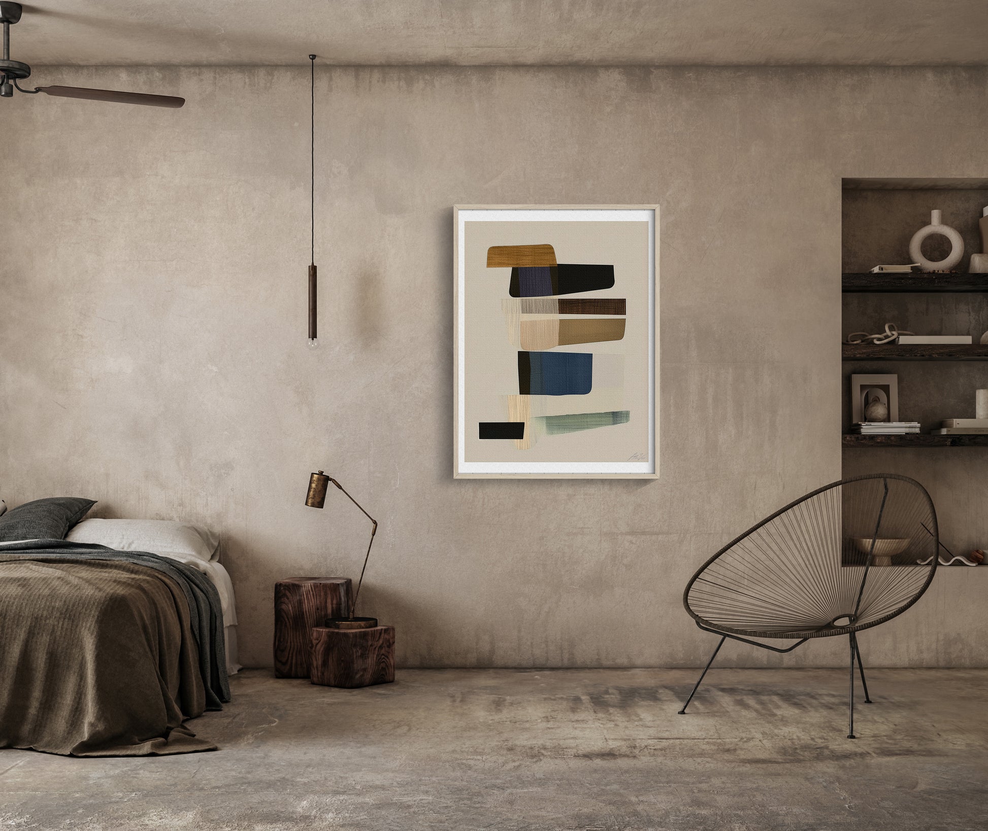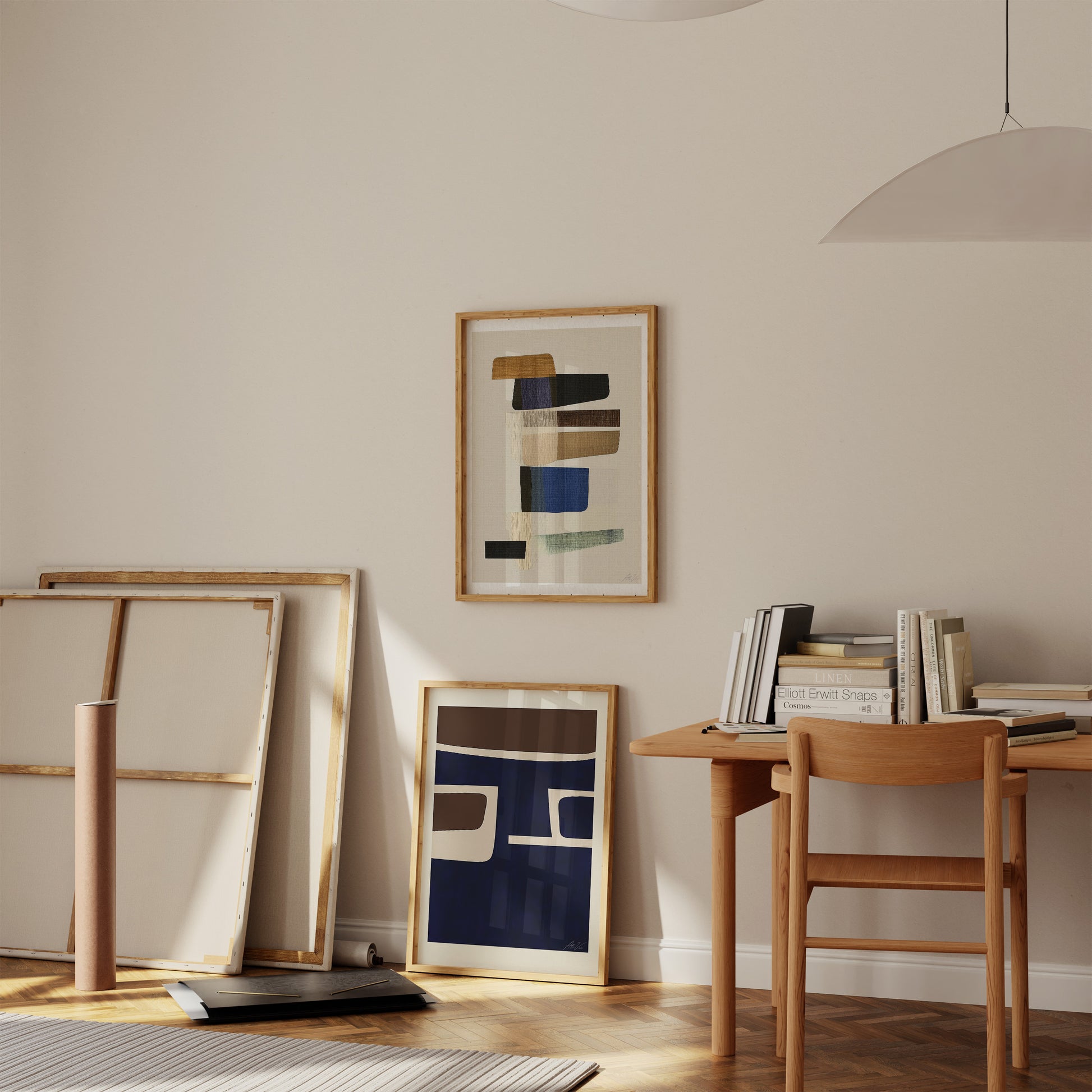 Layers of warm neutrals, deep blues, and grounded greens form a balanced abstract composition with a distinctly Scandinavian sensibility. The textured canvas, brushwork and subtle tonal shifts invite calm while adding quiet sophistication to any space. Perfect for modern interiors seeking art that blends refinement with a sense of ease.