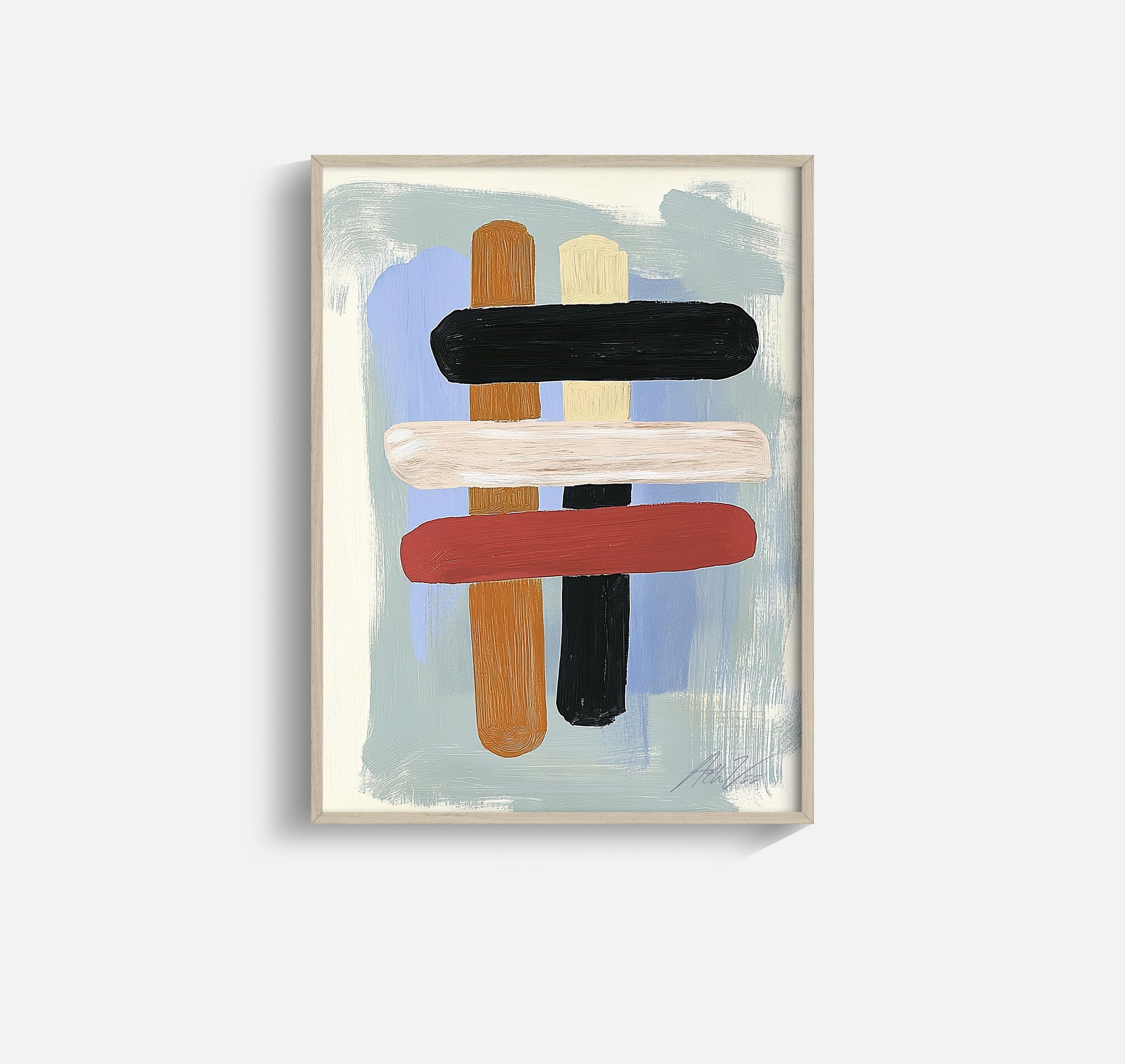 Totems of the North is a bold, rhythmic exploration of form and symbolism, inspired by ancient structures, stacked wood carvings, and Scandinavian tribal heritage. Earthy pigments of clay red, soot black, weathered white, and golden umber are layered like memory markers, anchored against a cool Arctic blue backdrop.