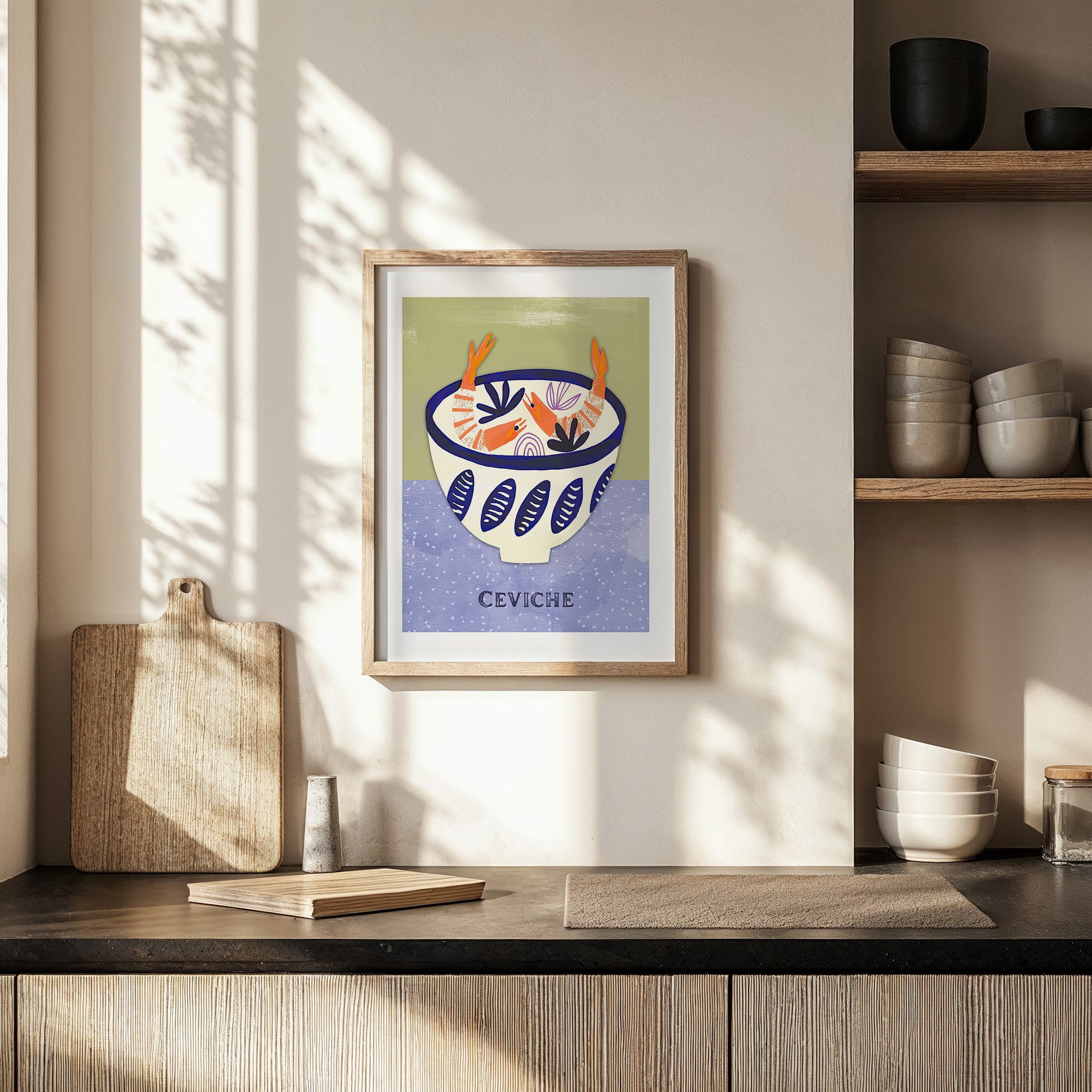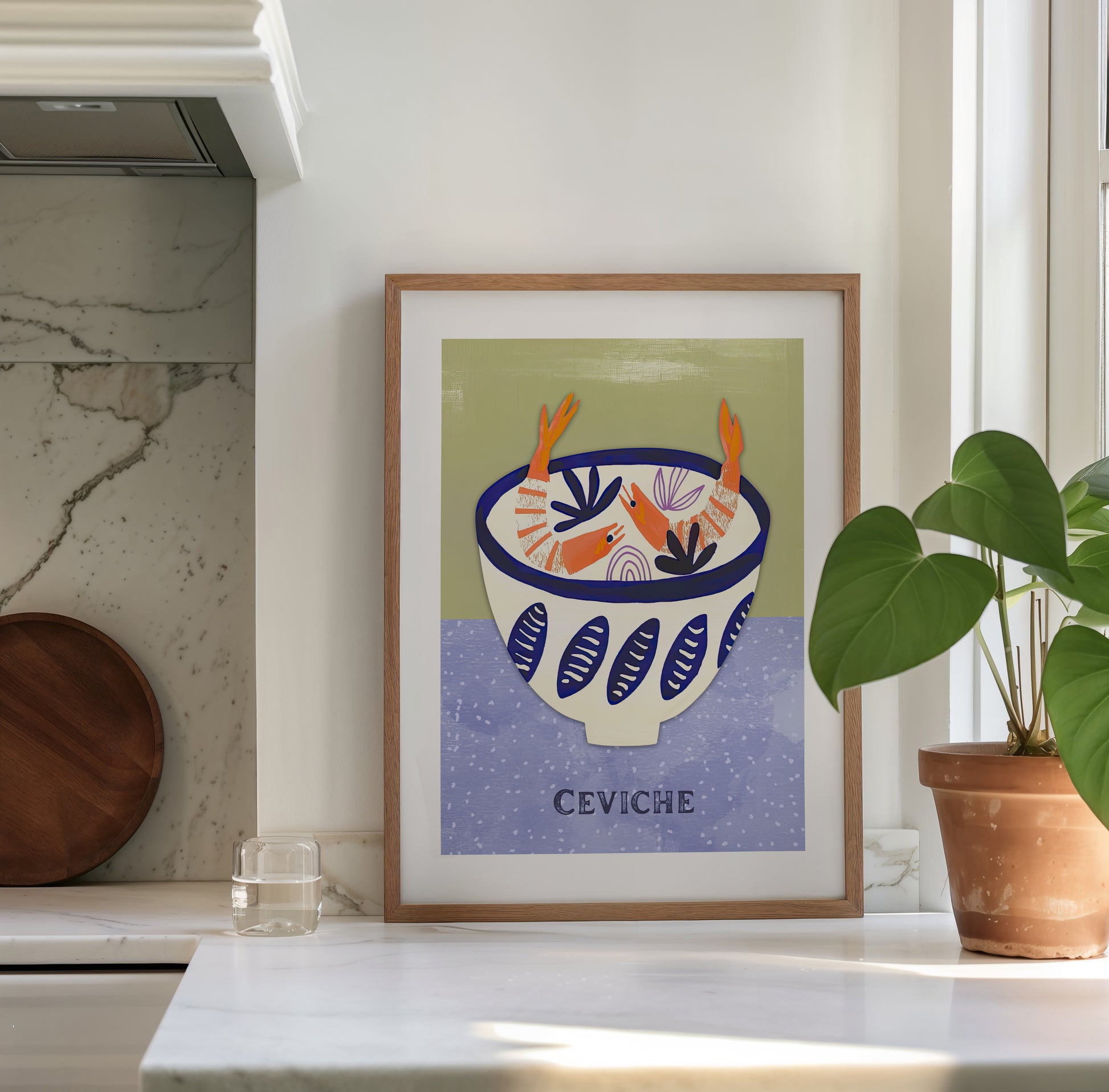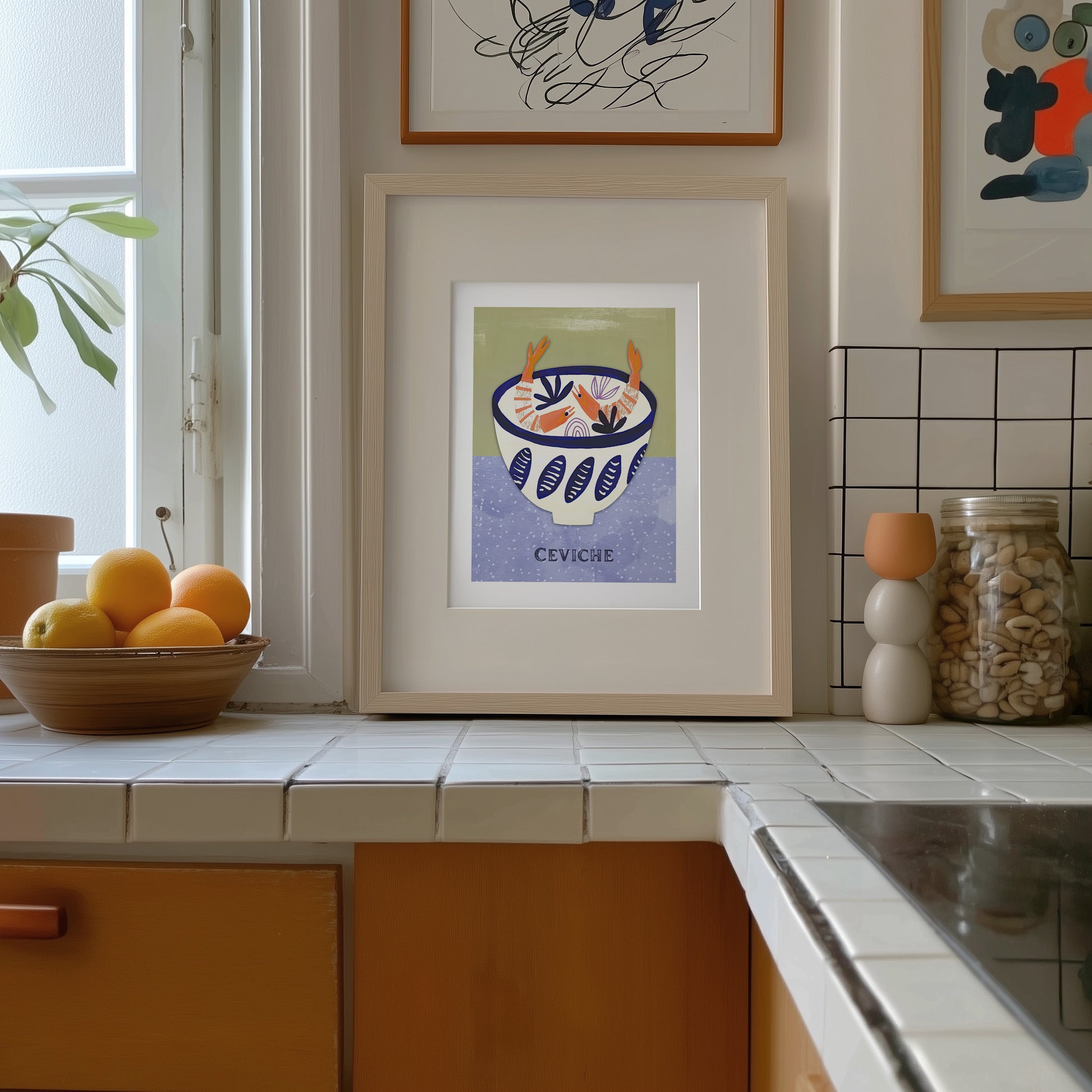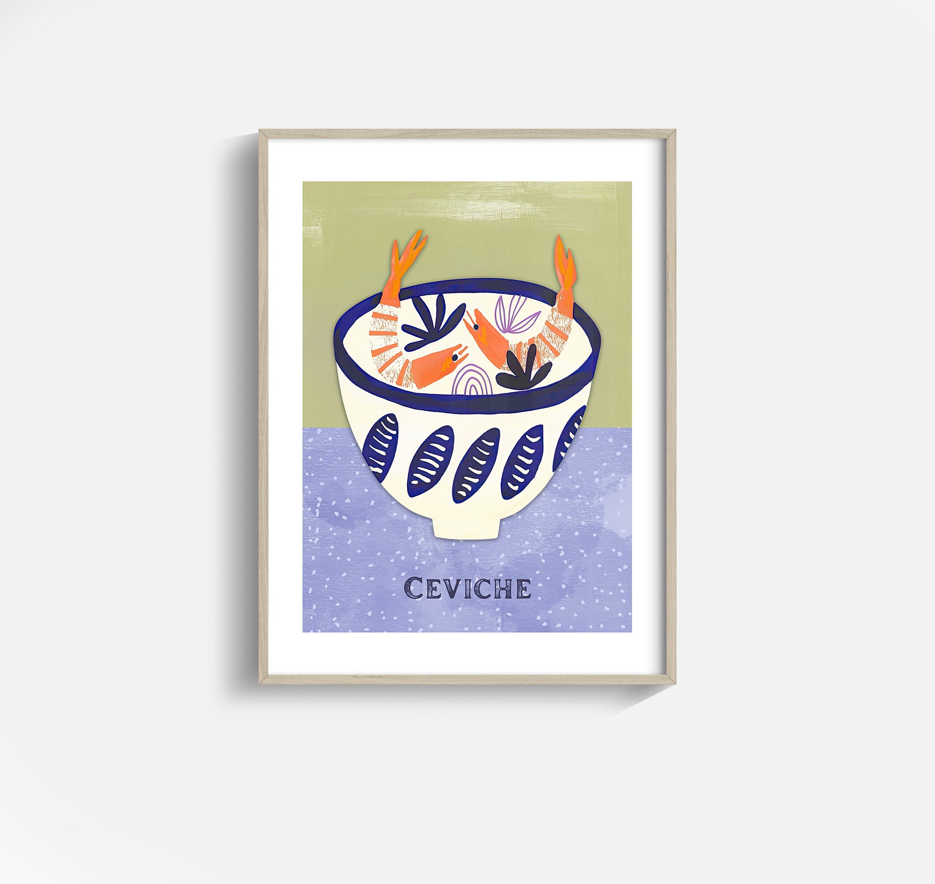 Fresh, zesty, and just a little bit cheeky — this stylized ceviche bowl blends graphic seafood forms with playful color blocking in indigo, lime, and lilac. With crisp lines and painterly textures, the print evokes the joy of a summer table without ever leaving the kitchen. A fun addition to your kitchen wall or bar nook, full of flavor and charm.
