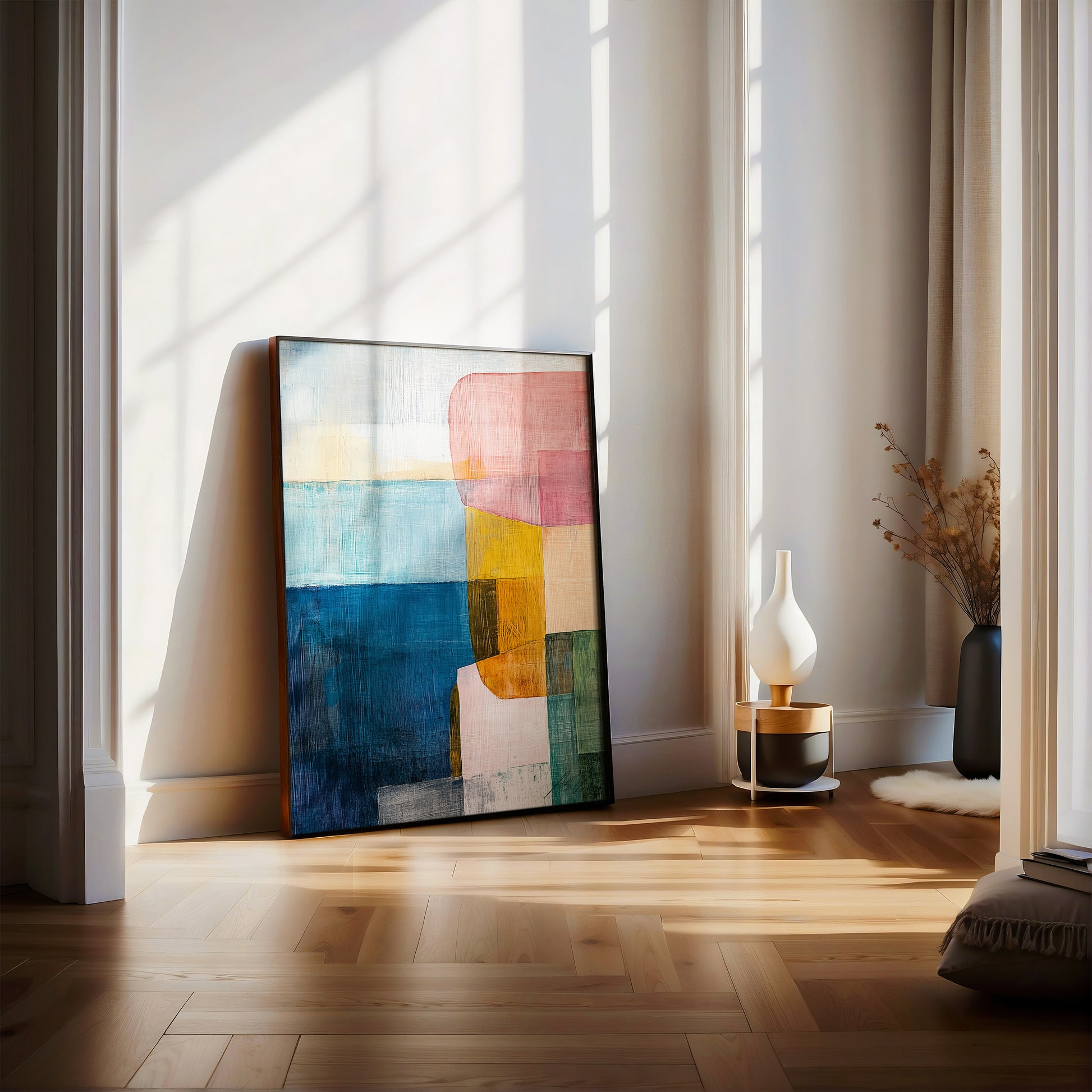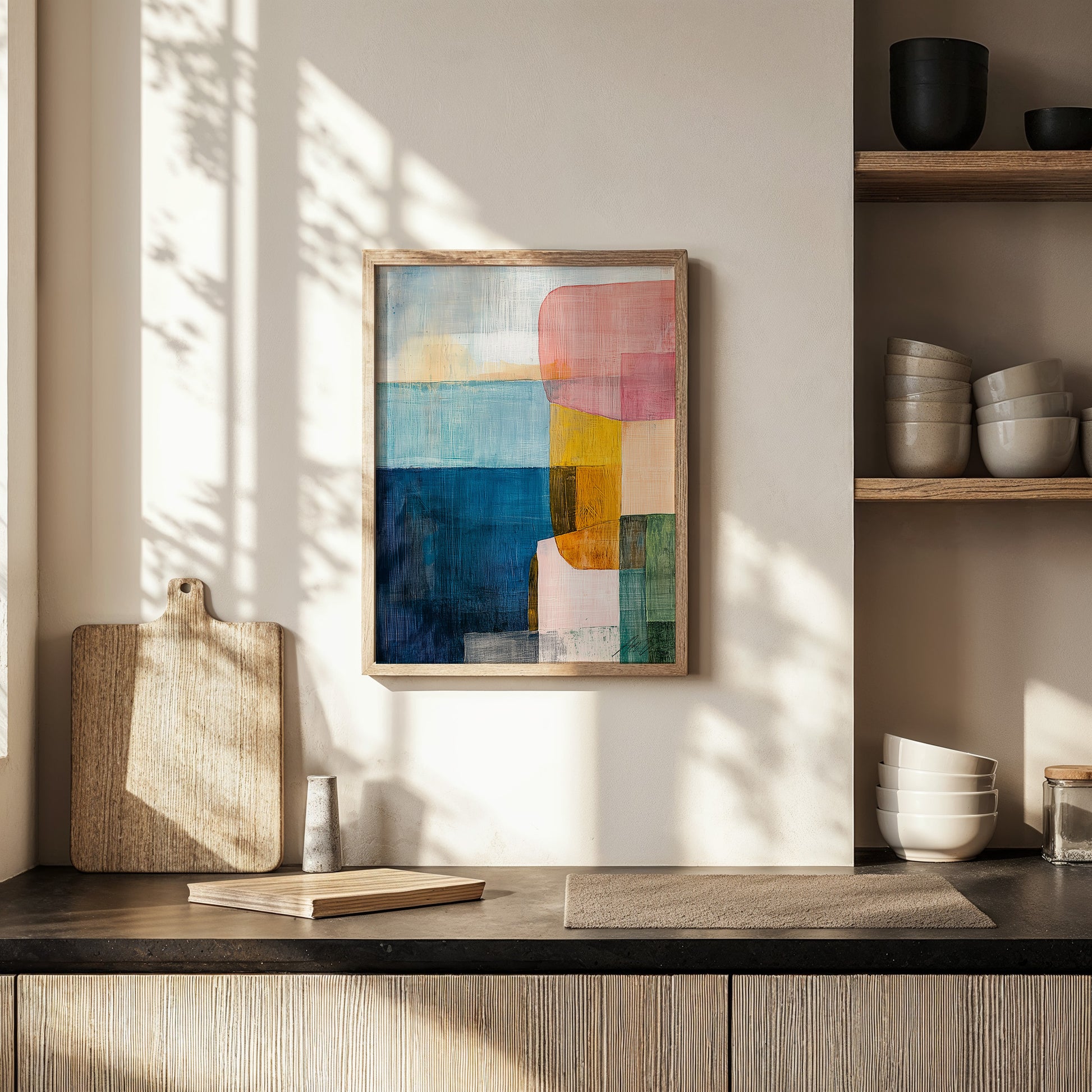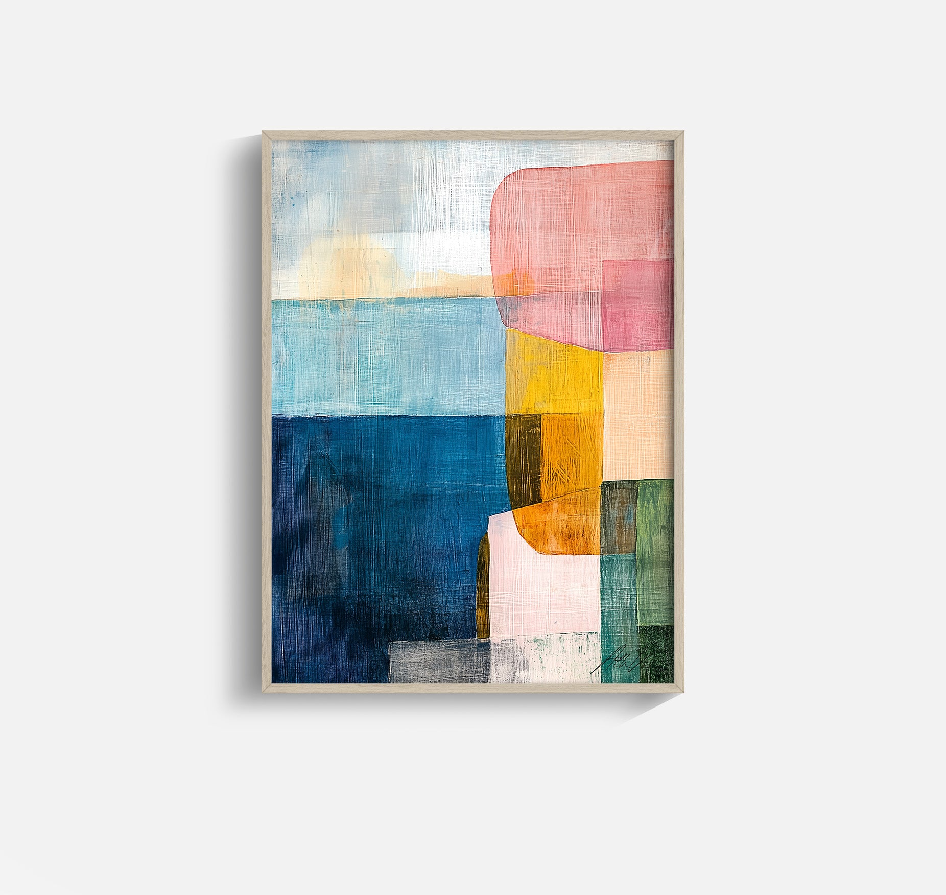 A poetic tribute to the Nordic coastline, Shifting Fjords II layers translucent blocks of ocean blues, muted peach, glacier pink, moss green, and warm ochre to echo the slow, elemental shifts of land and sea. This abstract seascape evokes both serenity and structure, perfect for modern interiors that crave color, movement, and quiet narrative.