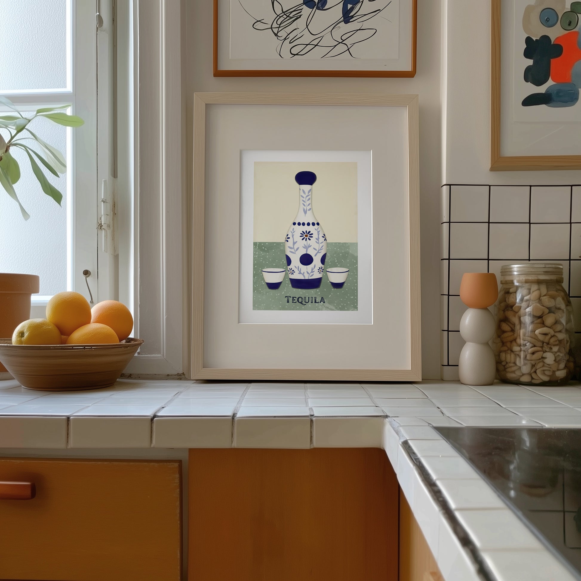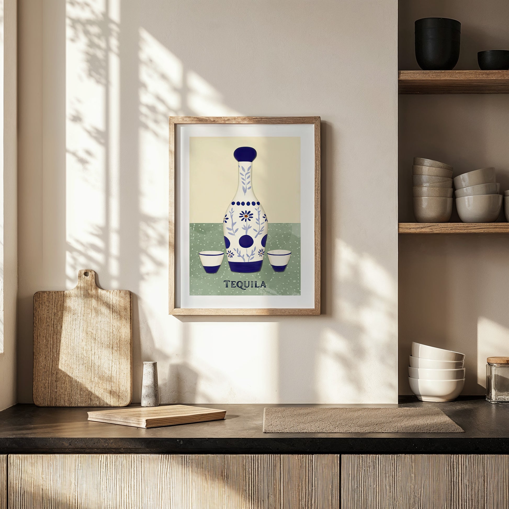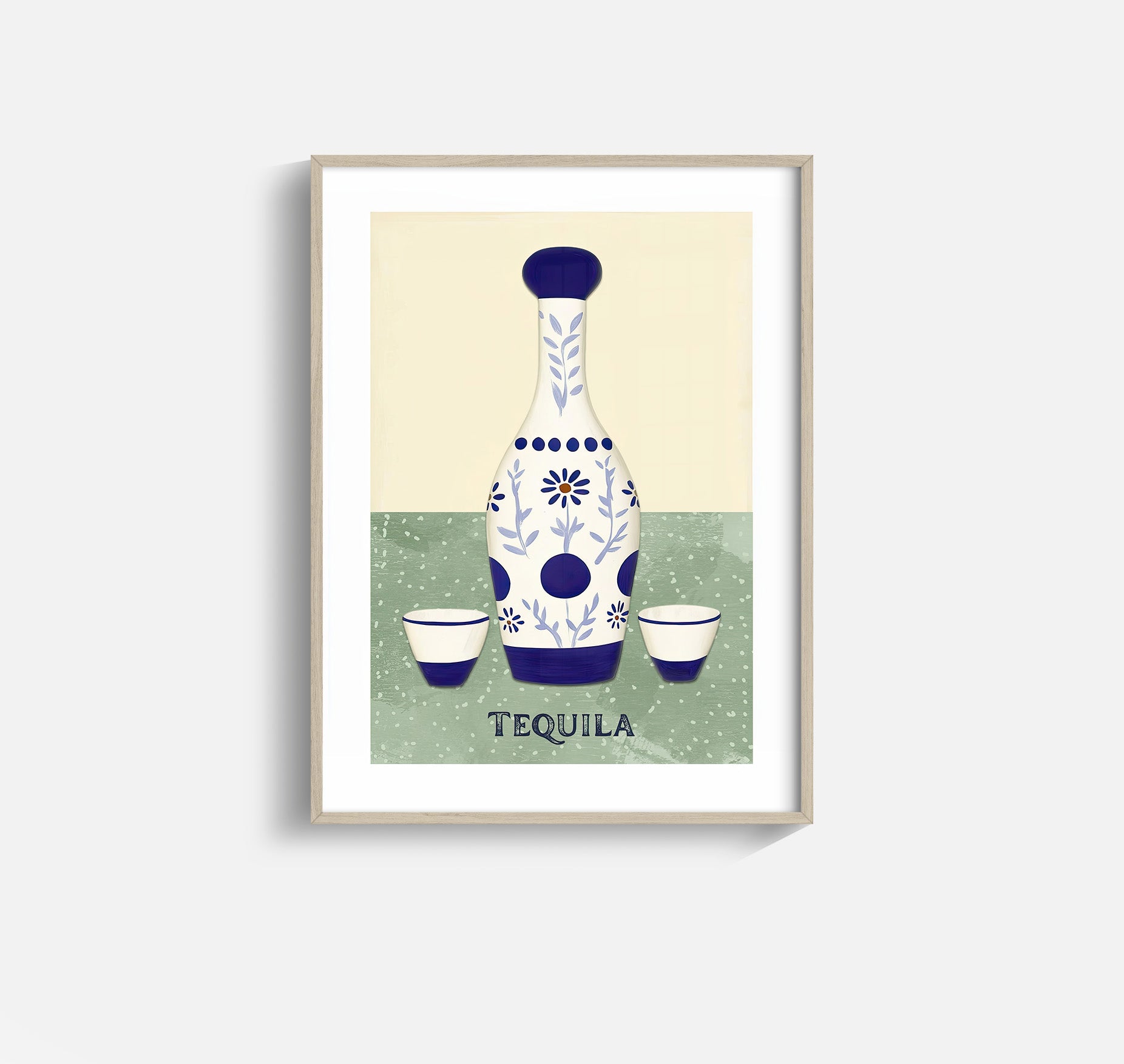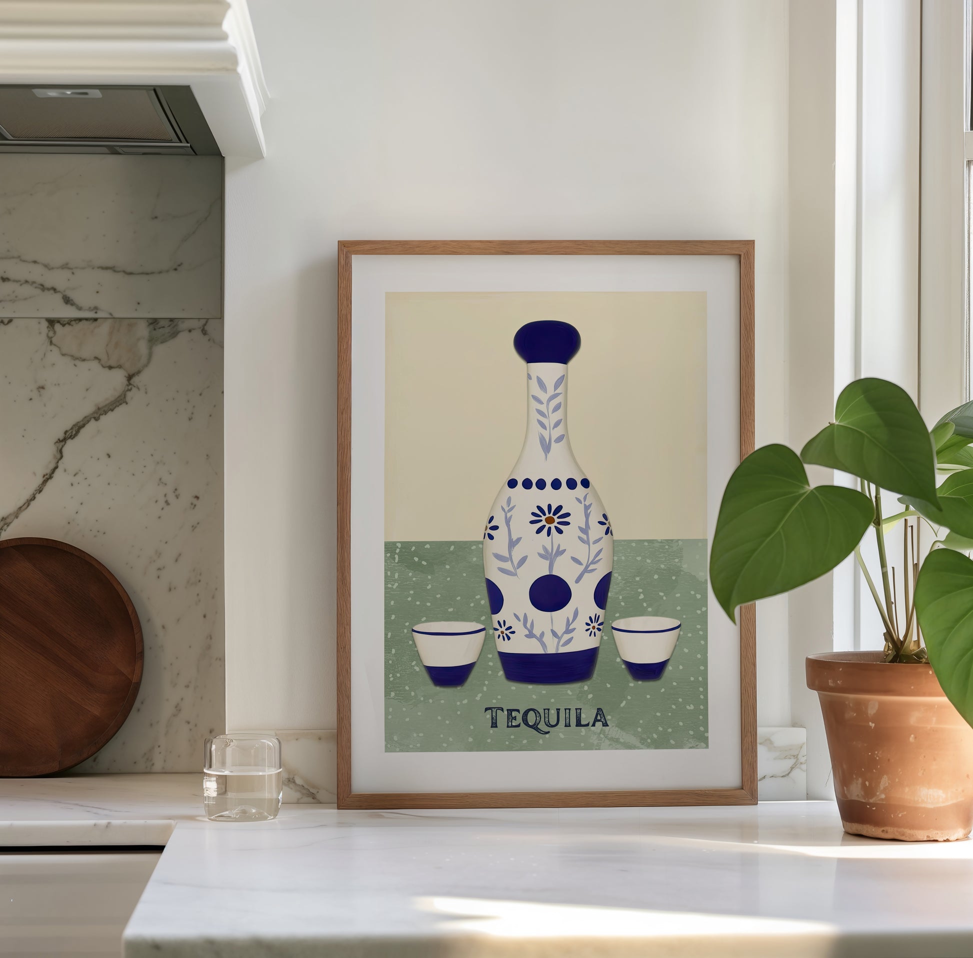 A bold, minimal take on a classic Mexican ritual. This print features a stylized blue and white Talavera tequila bottle flanked by two matching copitas, set against a sage green tiled backdrop for a clean yet celebratory vibe — perfect for kitchen walls, bar carts, or festive dining spaces.