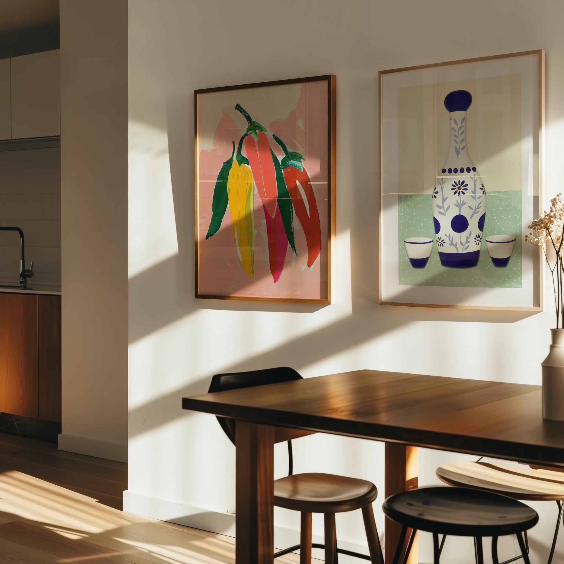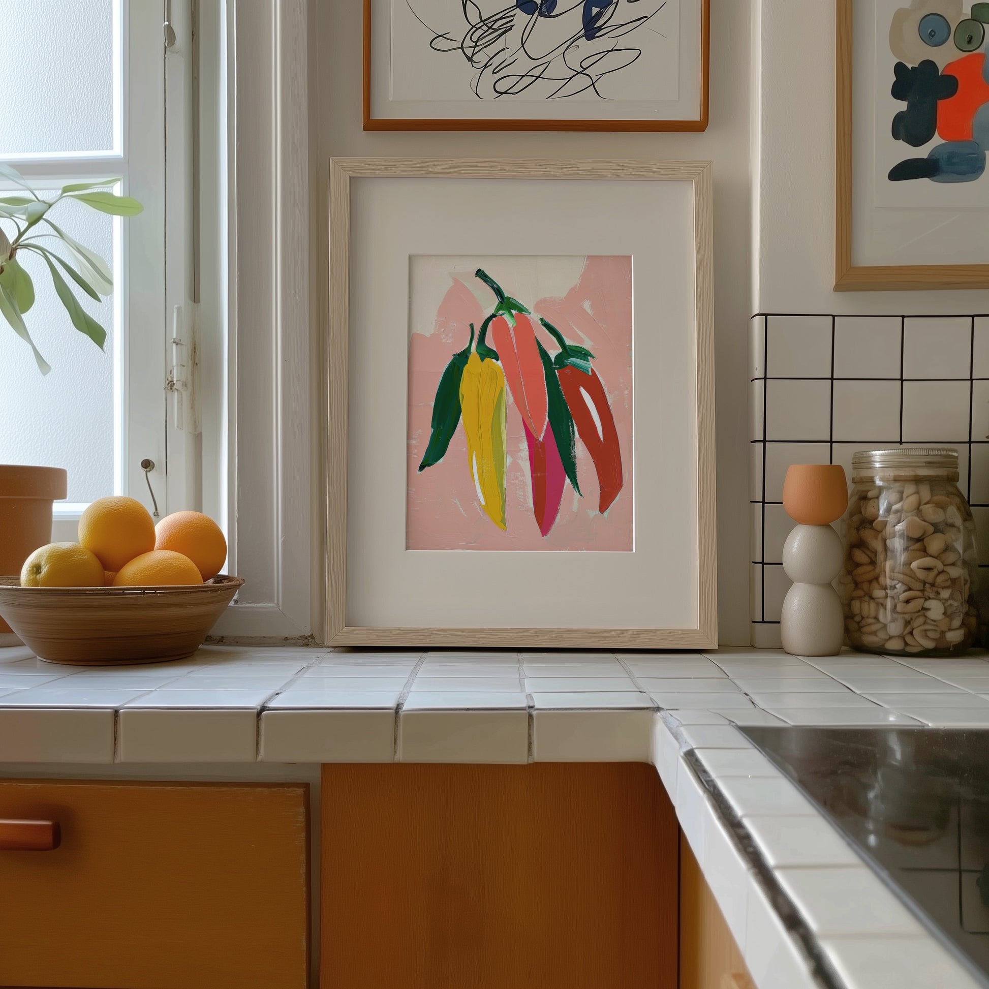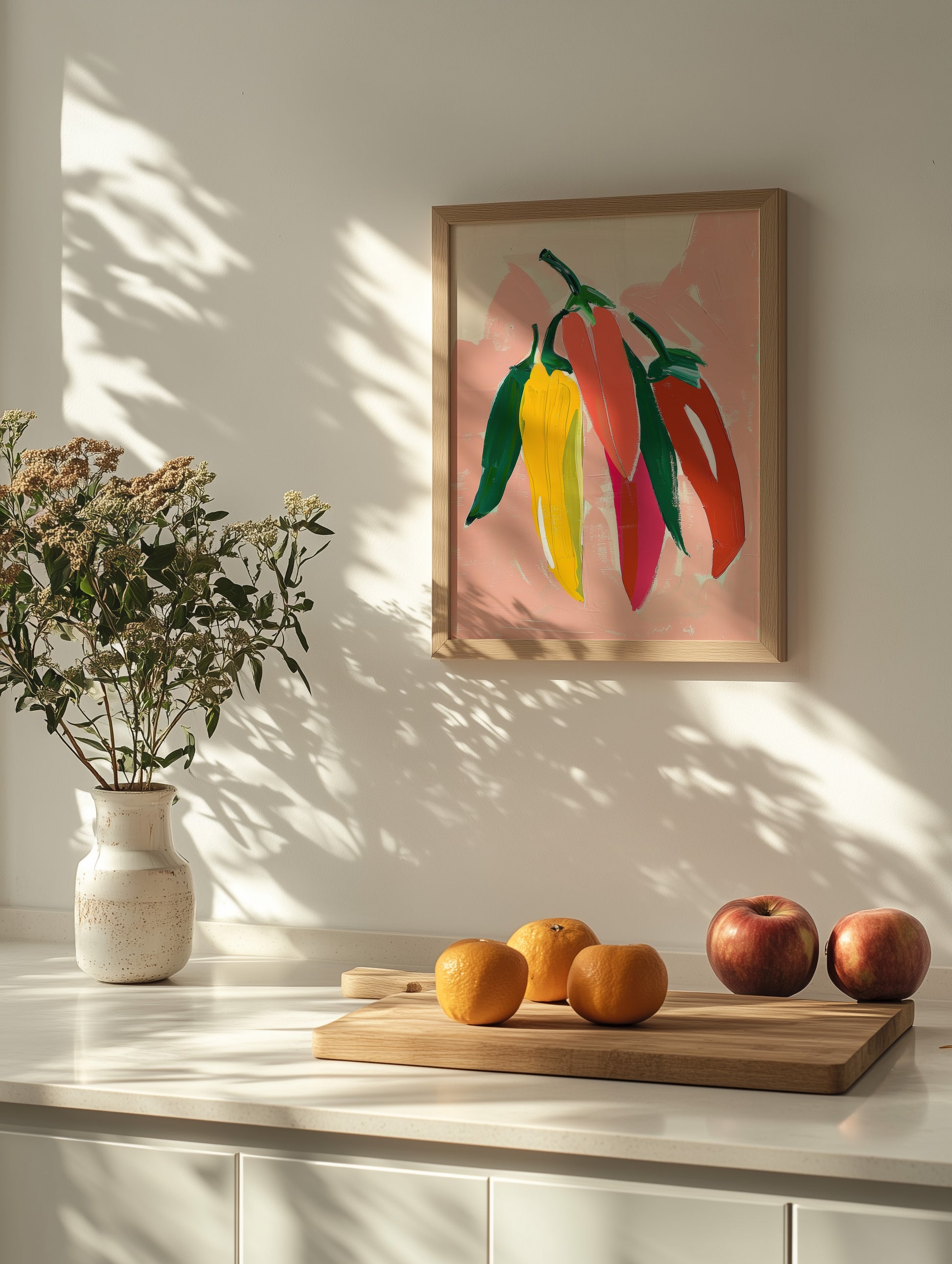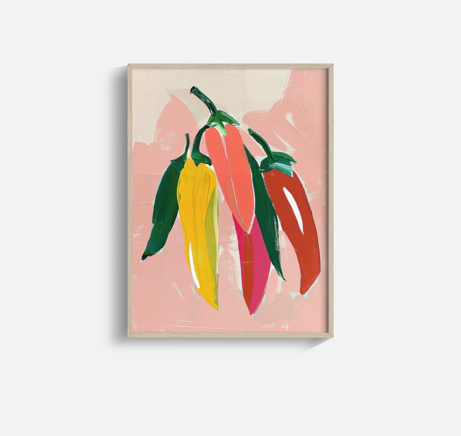 Hot Bunch brings flavor and attitude to your kitchen or dining space with its loose brushwork and saturated color play. A cluster of chili peppers — crimson, golden, coral, and green — bursts against a chalky pink backdrop, striking a balance between playful and punchy. Perfect for kitchens, cafés, or anywhere a little spice is welcome.